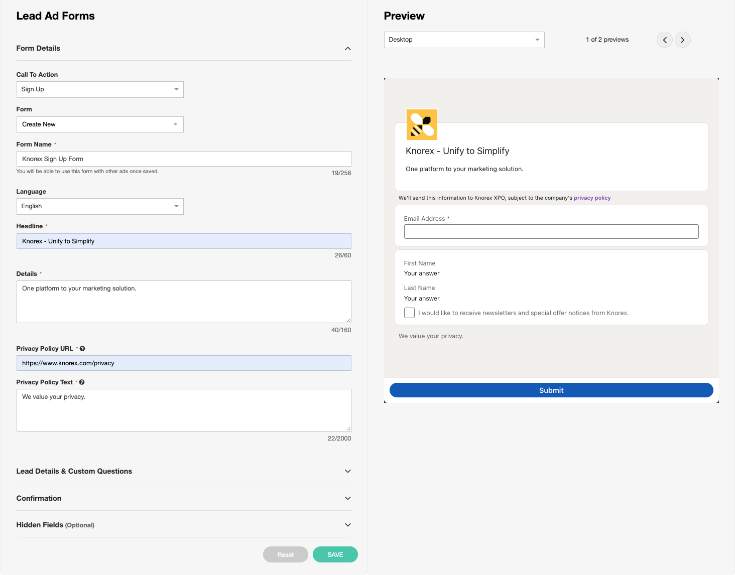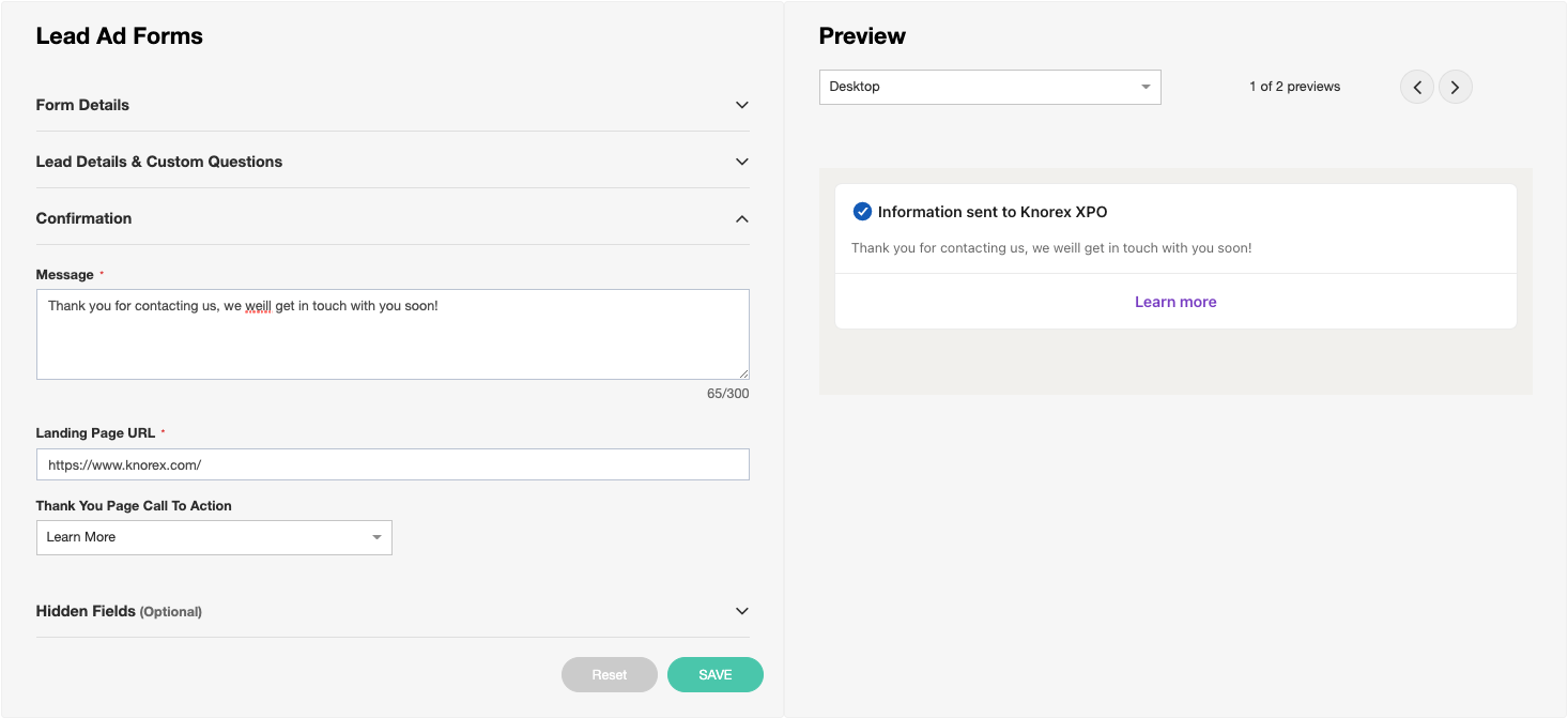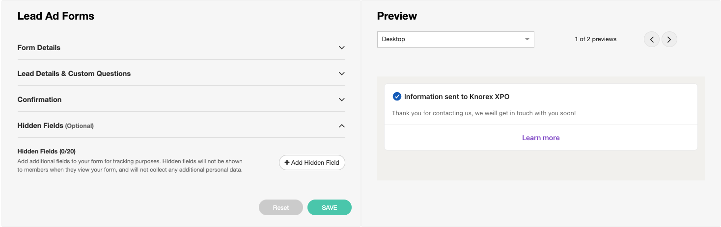 Form Details Lead Details & Custom Questions Confirmation Hidden fields - Click Save.