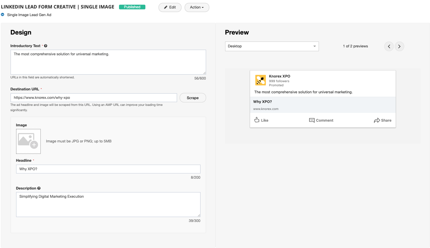 In the Design section, build the LinkedIn creative by completing the information such as the text, display link, headline, description, and a call-to-action, if required, depending on the creative type.