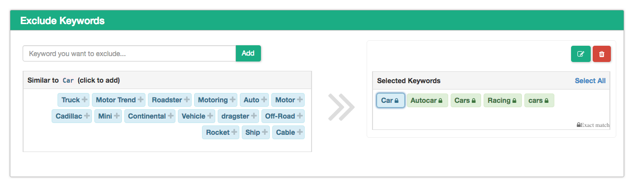 - Input the Keyword you wish to Include or Exclude. (Example: key in Exclude Keyword "Car" if you wish to exclude cars).