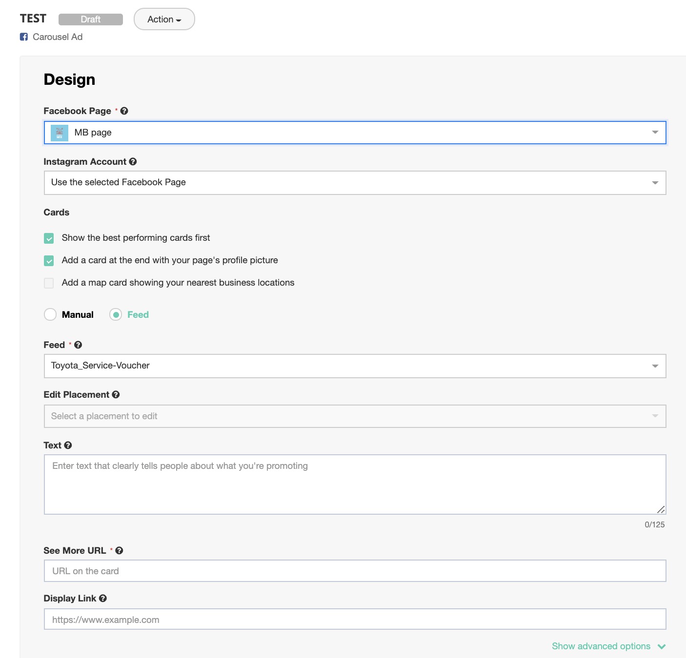 With XPO, you can link a feed (in CSV format) to a Facebook Carousel Ad to create multiple cards with different images, headlines, and descriptions.
