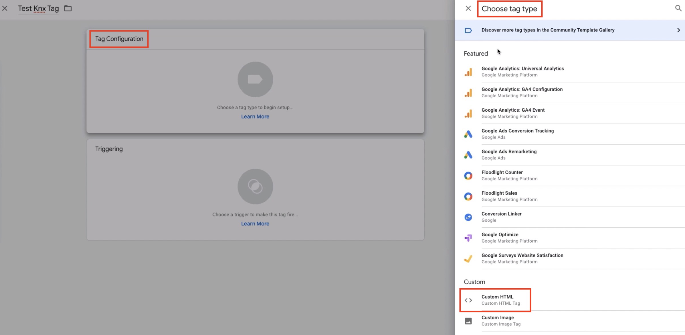 3. Click Tag Configuration. In the Choose tag type pop-up menu, look under the Custom section and click Custom HTML to create/add a custom HTML tag.
