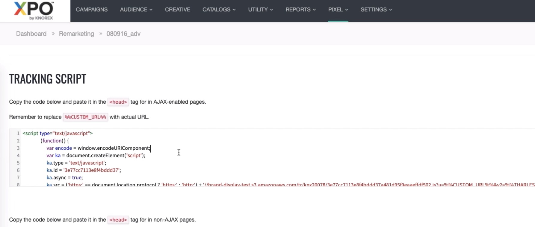 5. Using Method 1 or 2 (explained below), copy the XPO pixel script that you have created and paste it into the HTML field from the previous step. Click Save. (Learn how to generate conversion pixels or generate remarketing pixels in XPO)
