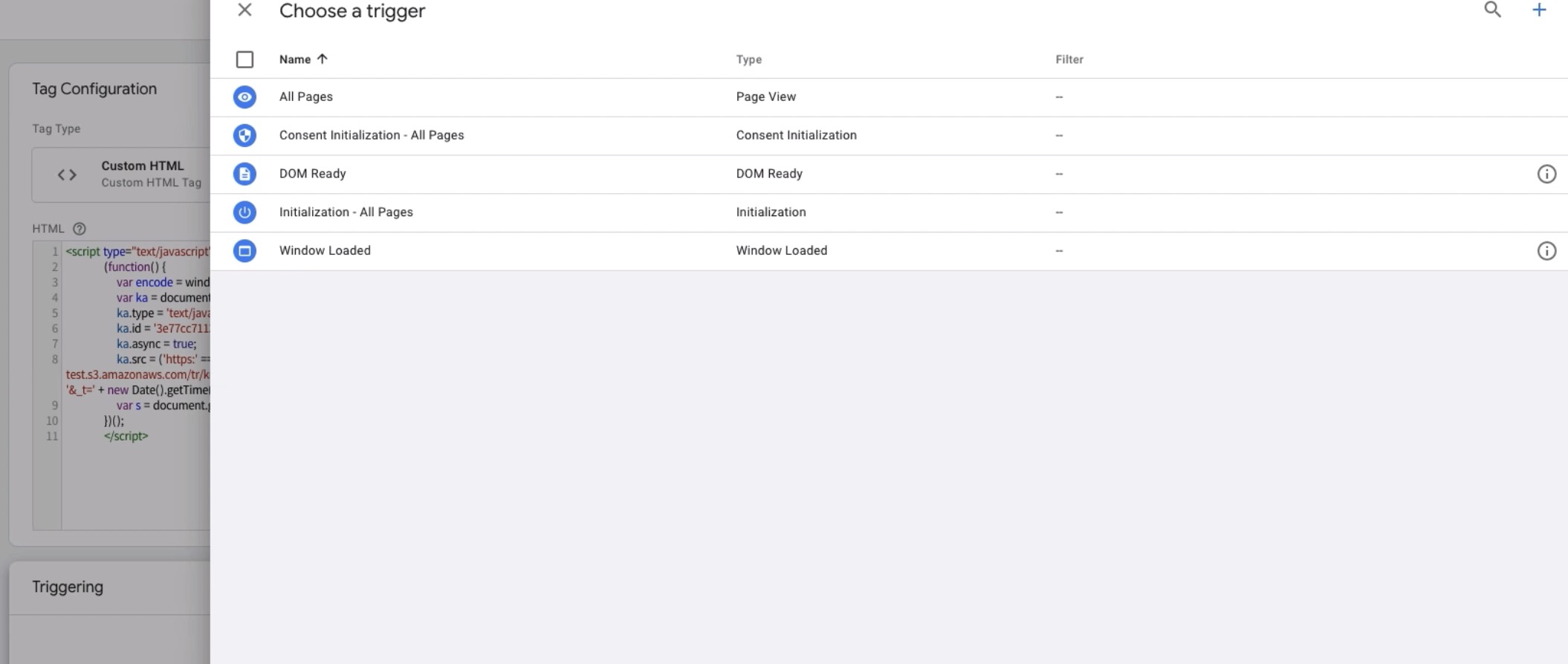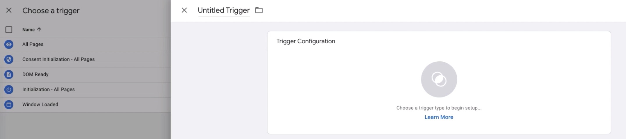 7. Select a trigger from the default list of triggers, including page views, clicks, and user engagement.