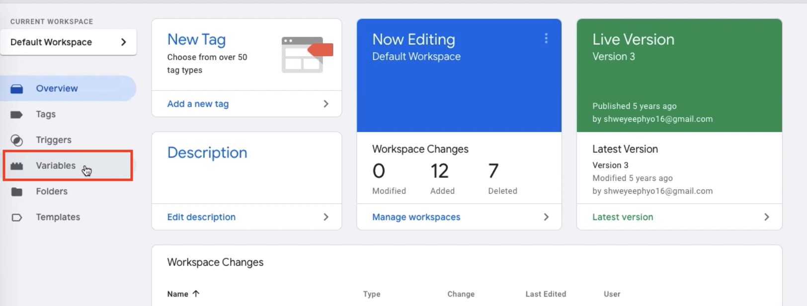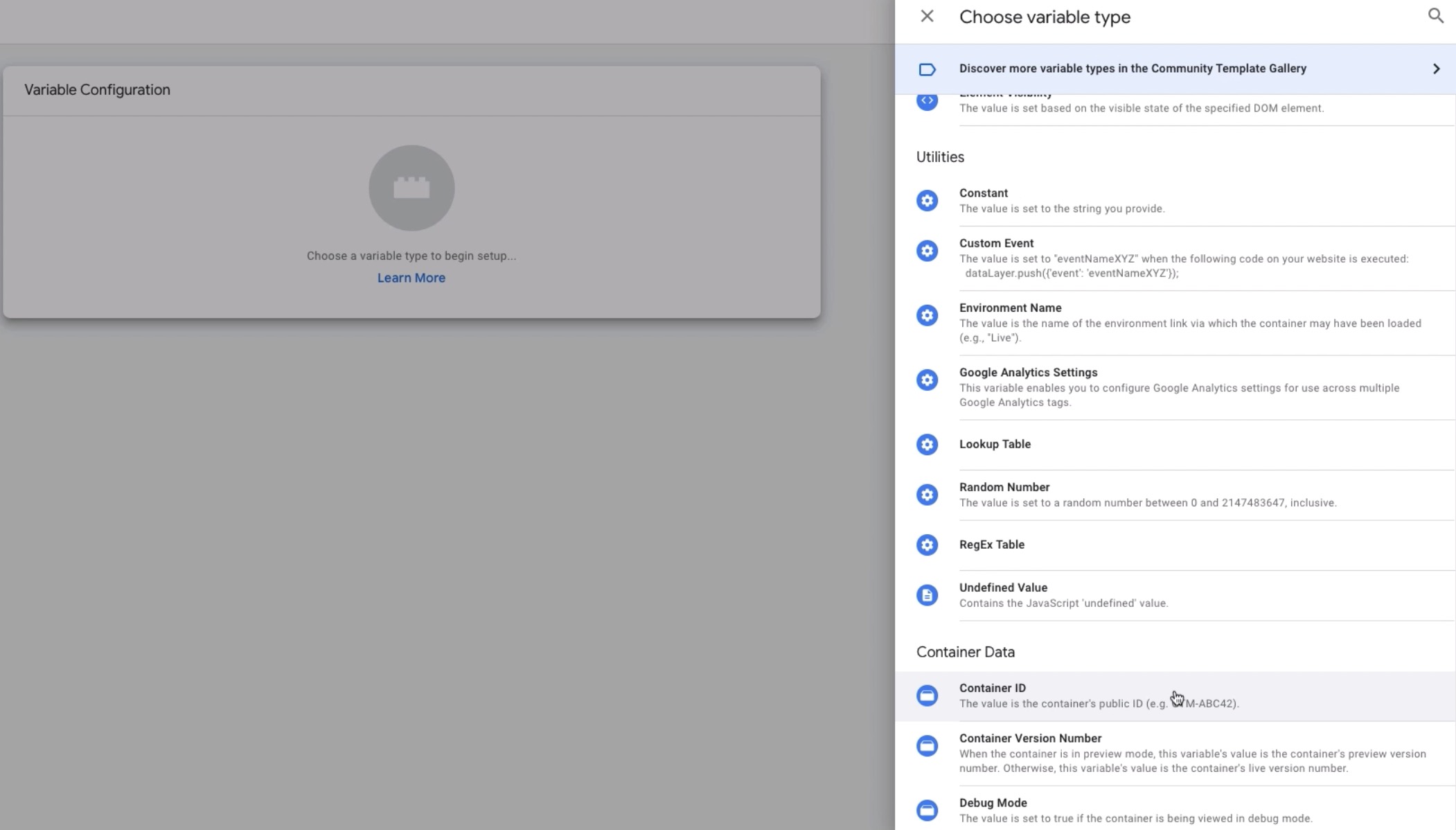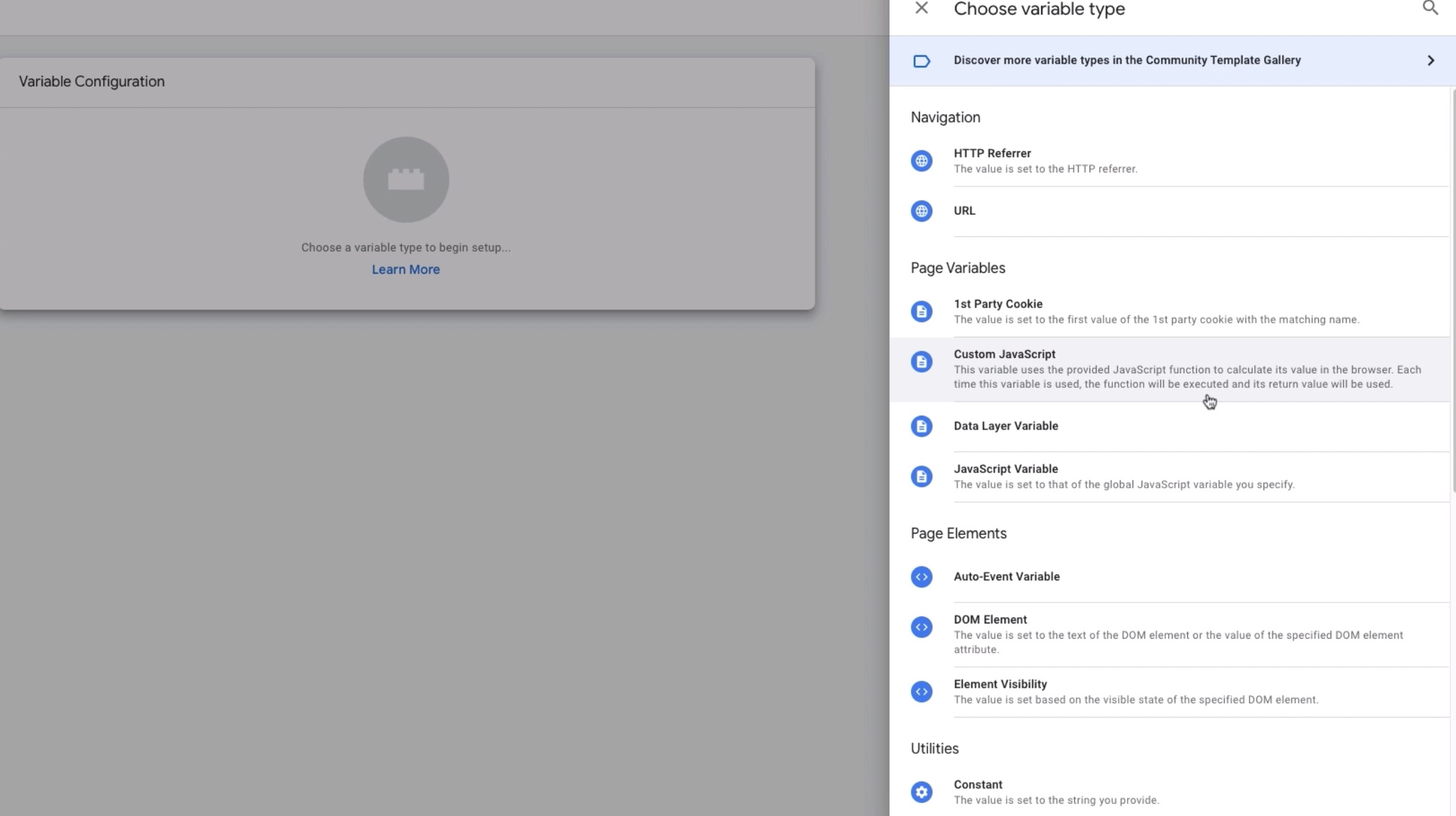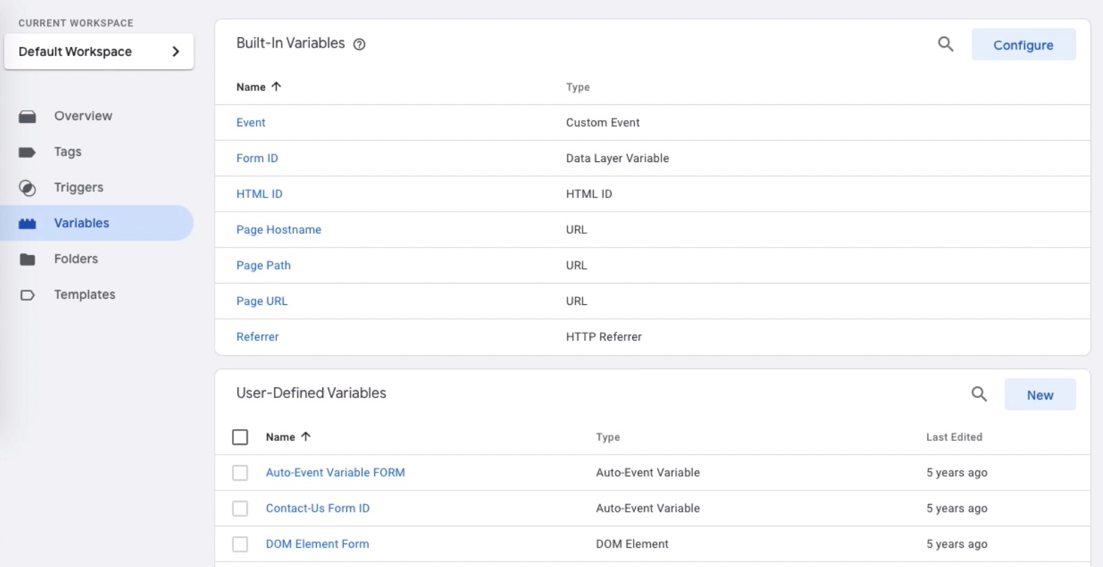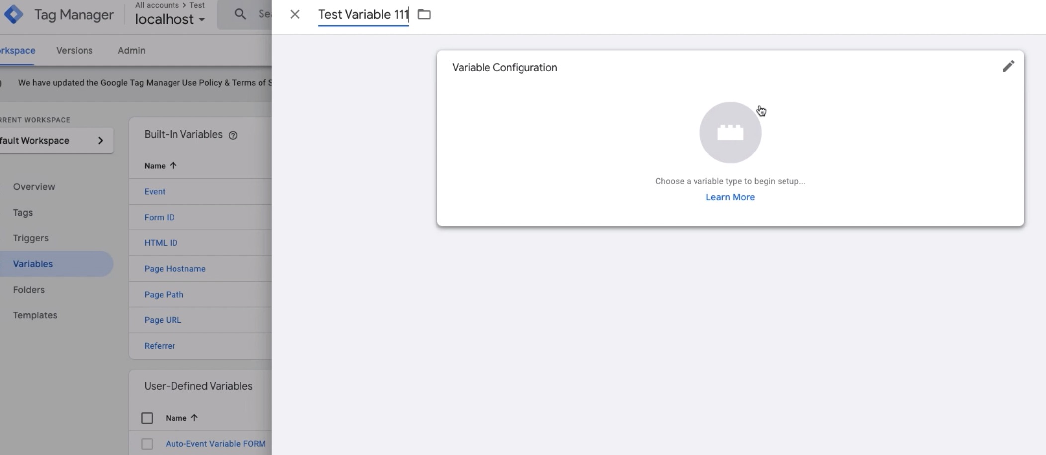 9. Next, configure or create variables which you can use for passing values from the webpages into the pixel. You can either use the Built-in Variable or create a User-Defined Variable