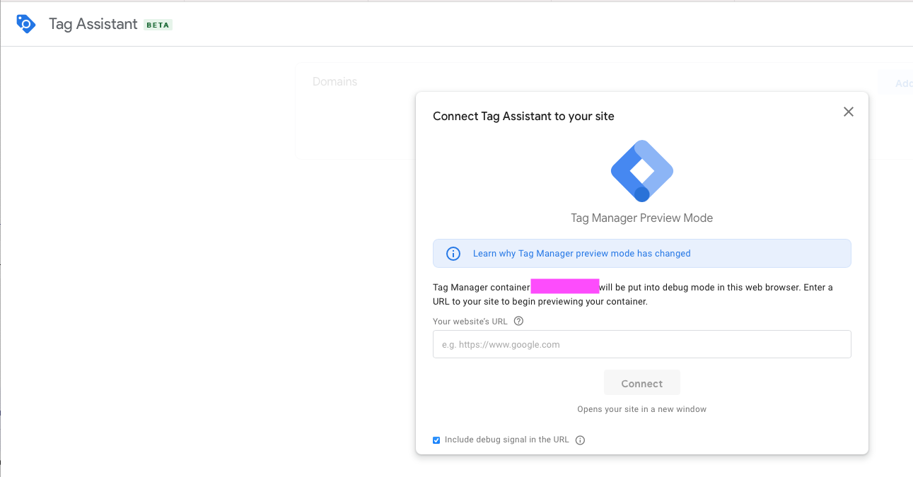 13. Save the HTML custom tag. Use the GTM Tag Assistant to preview and verify that the custom tag is working properly. Enter the URL of the page where the tag is expected to trigger, then click CONNECT. A browser window will open with your URL, activating the tag.