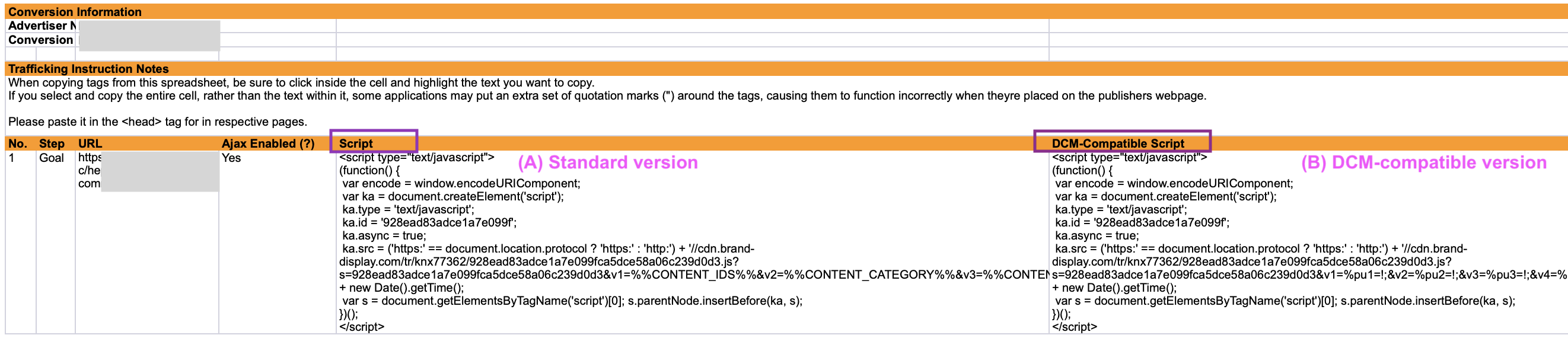 Since you are using GTM, copy the (A) Standard script instead of the (B) DCM-compatible version from the Excel file (for use with Floodlight tags    such as Google SearchAds 360 or Campaign Manager 360).