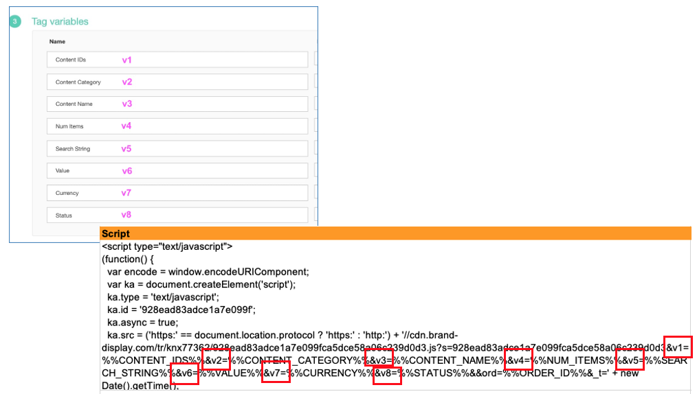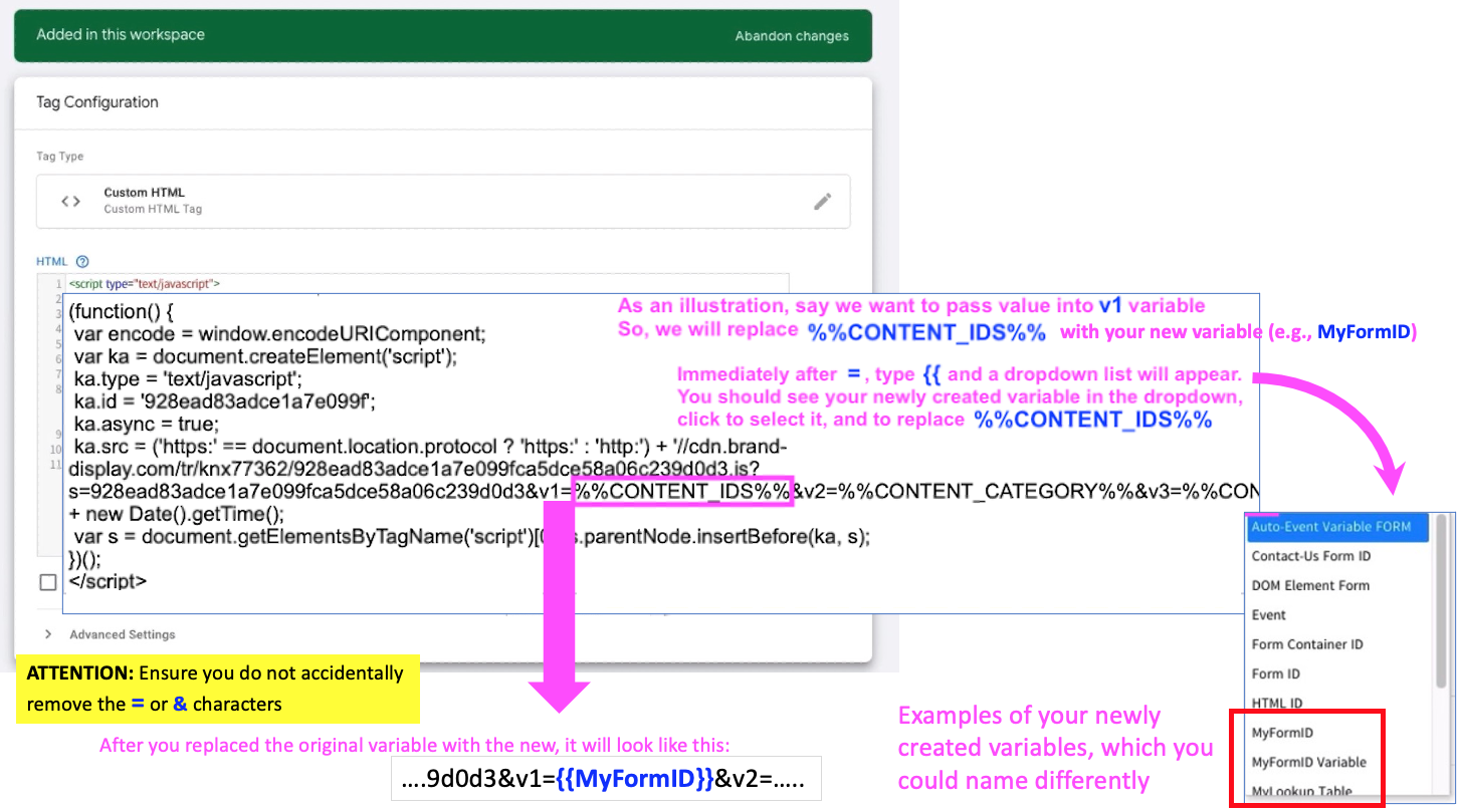 12. To add the newly created variable to your HTML custom tag, (i.e. passing the value to the script), open the tag that you created earlier in Step 3 (above). Replace the original variable in the script with your new variable. See the below screenshot for more details.