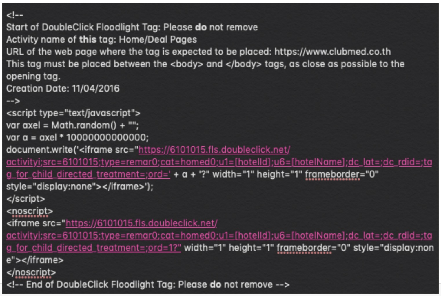 Copy the content of the HTML image tag img inside the noscript section of the JavaScript pixel and paste it into the tag container or manager of DCM/DFA.