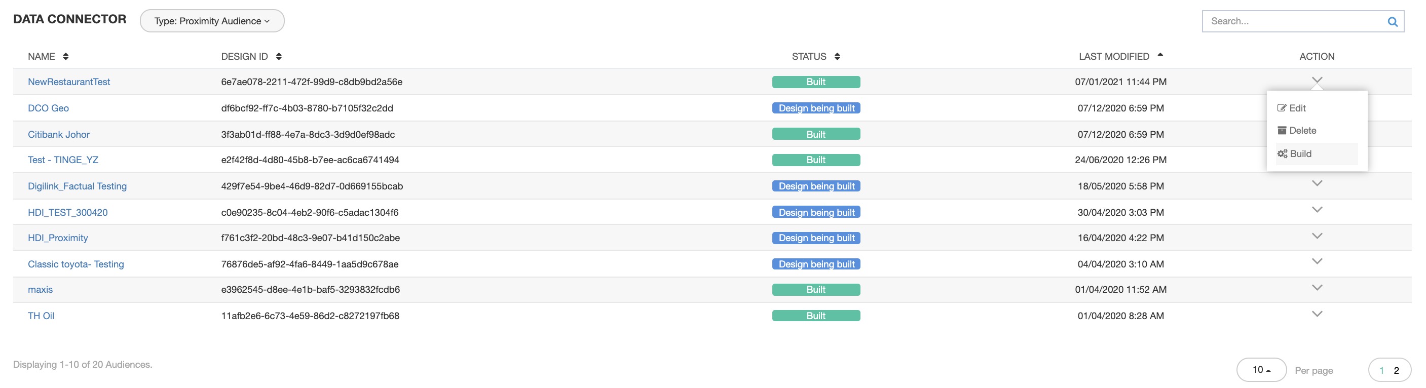 - The Proximity Audience created will now appear on the Data Connector list. You will need to Build this audience.