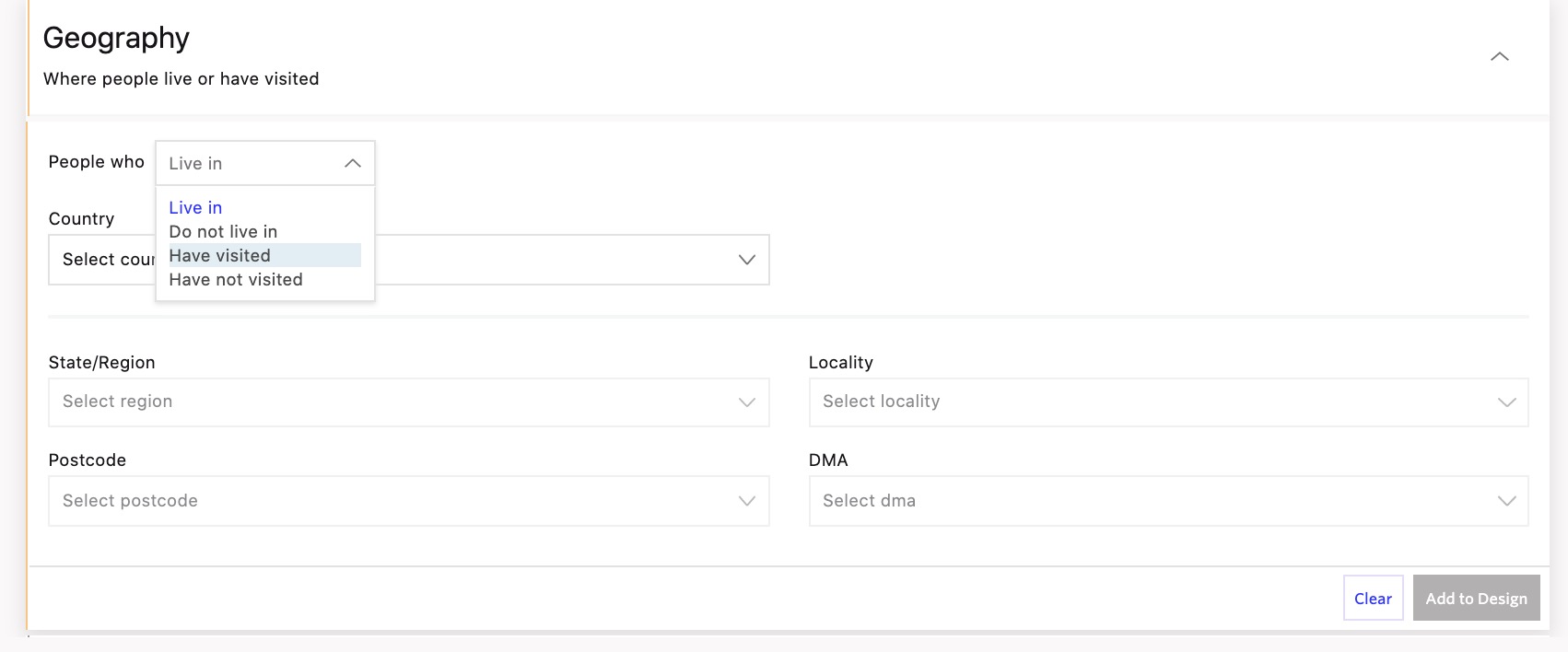 Here, you can target audiences based on where they live (or lived in the past) or even a geographical area that has been visited in the past.