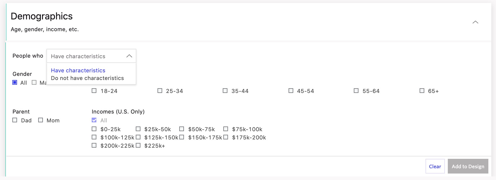 Target based on age, gender, income (US$ only), and you can also target based on the parental status with the relevant product or service, based on your ad message. - Click Add to Design, save it on the Factual/Foursquare interface, and then save it in the XPO dashboard.