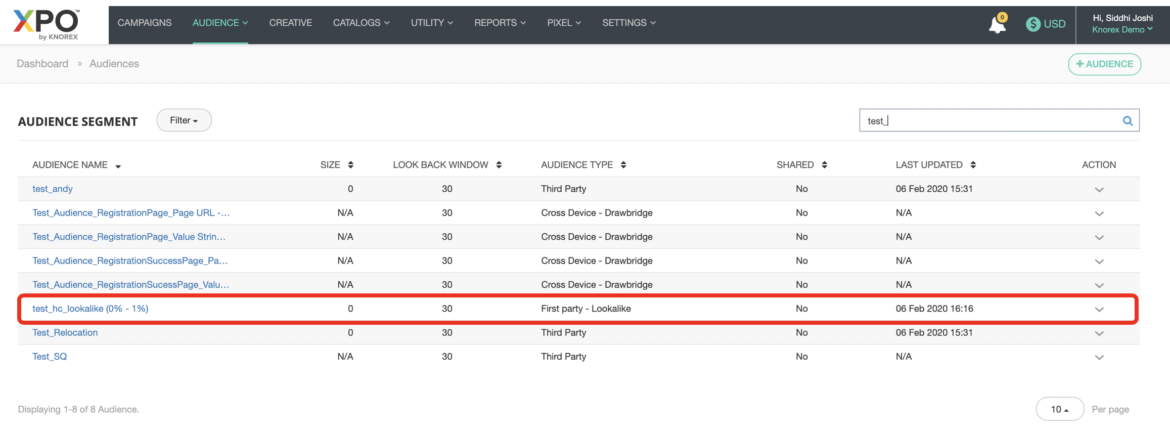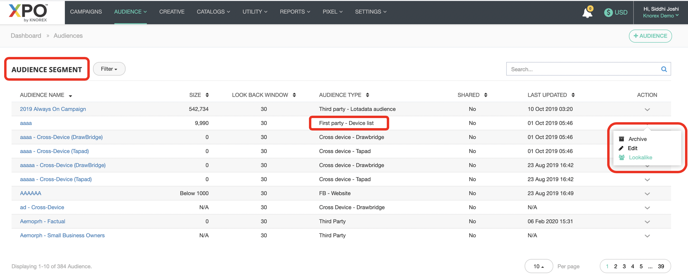1. Under the Audience menu, select an existing First Party Audience Segment that you have created. Then, under the Action column, select Lookalike from the dropdown menu.