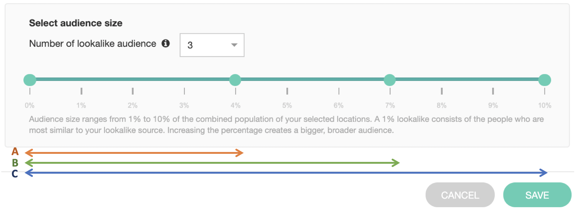 • 'C' is a lookalike audience at 10% where the audience size is the broadest, but with the least number of similarities to the source compared to A and B.