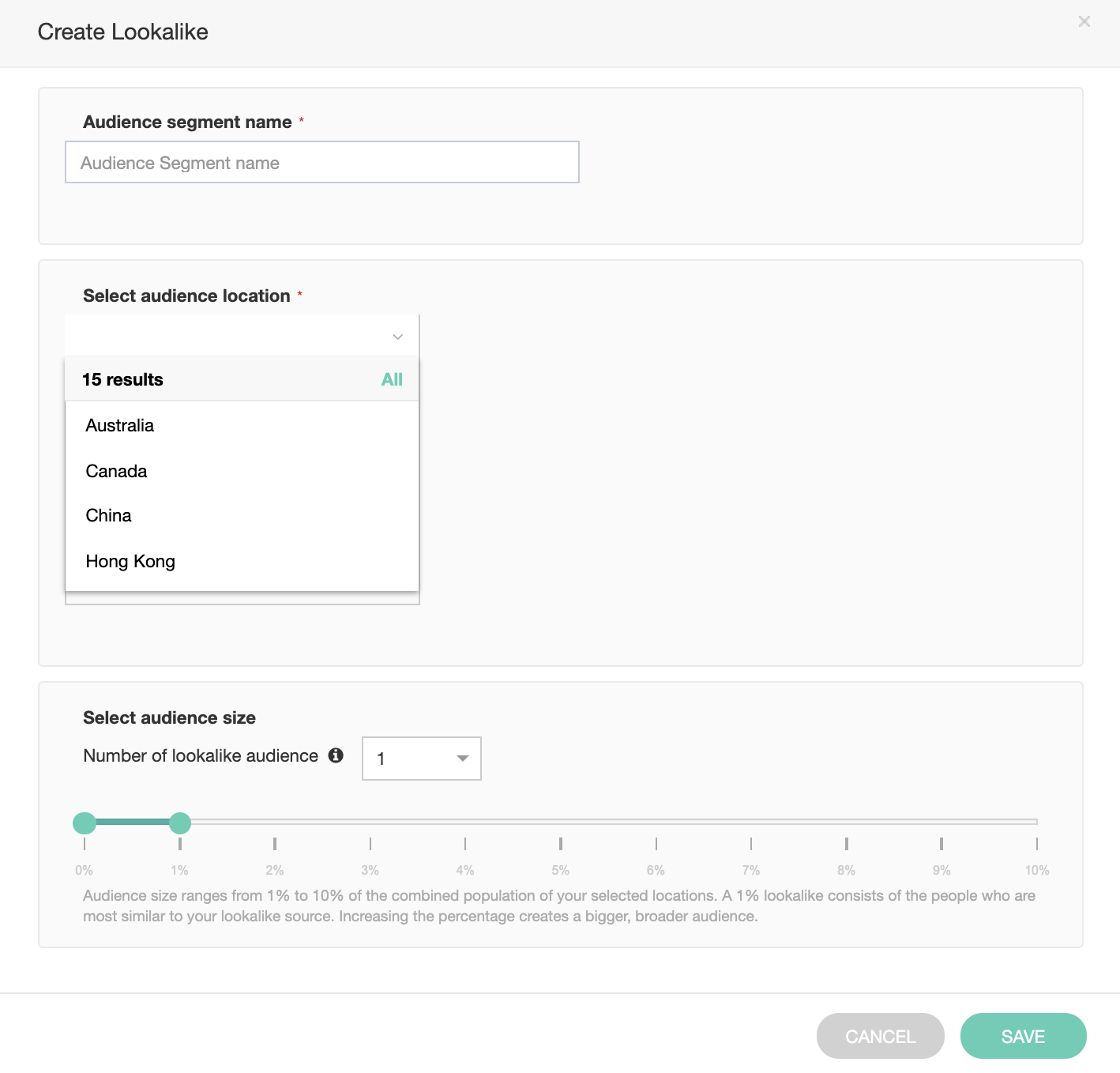 3. Select your Audience Location. Based on your first party data collected from different countries, you can narrow your lookalike audience range by selecting one or more countries that you wish to target.
