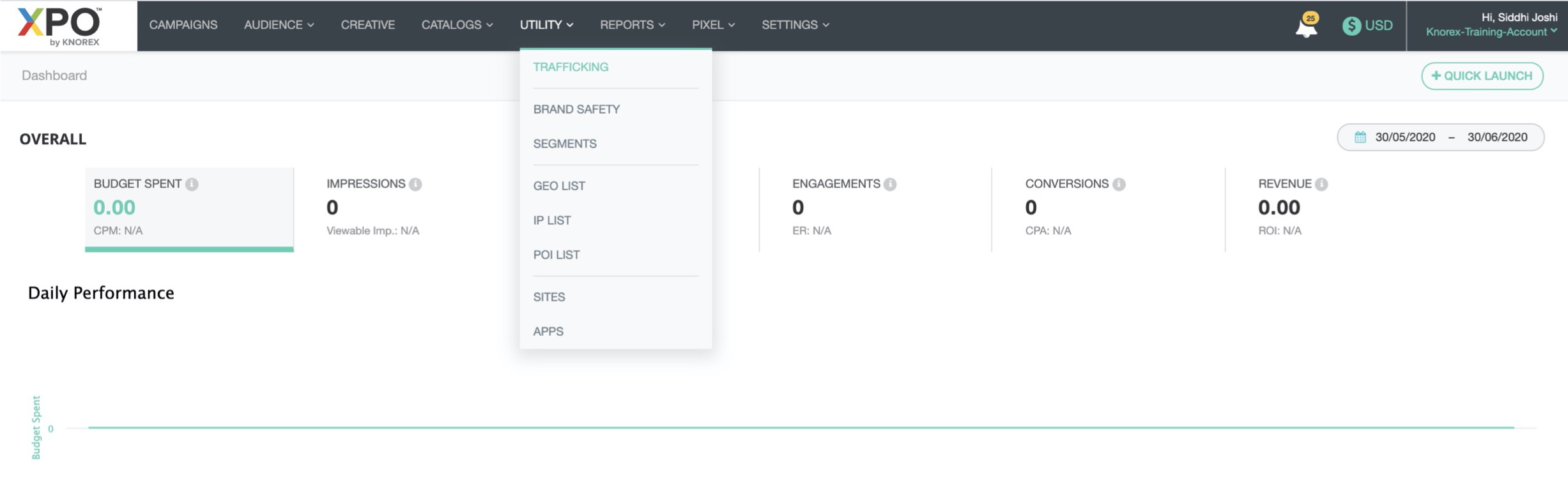 - From your Partner Dashboard, go to the menu bar and click Utility > Trafficking.