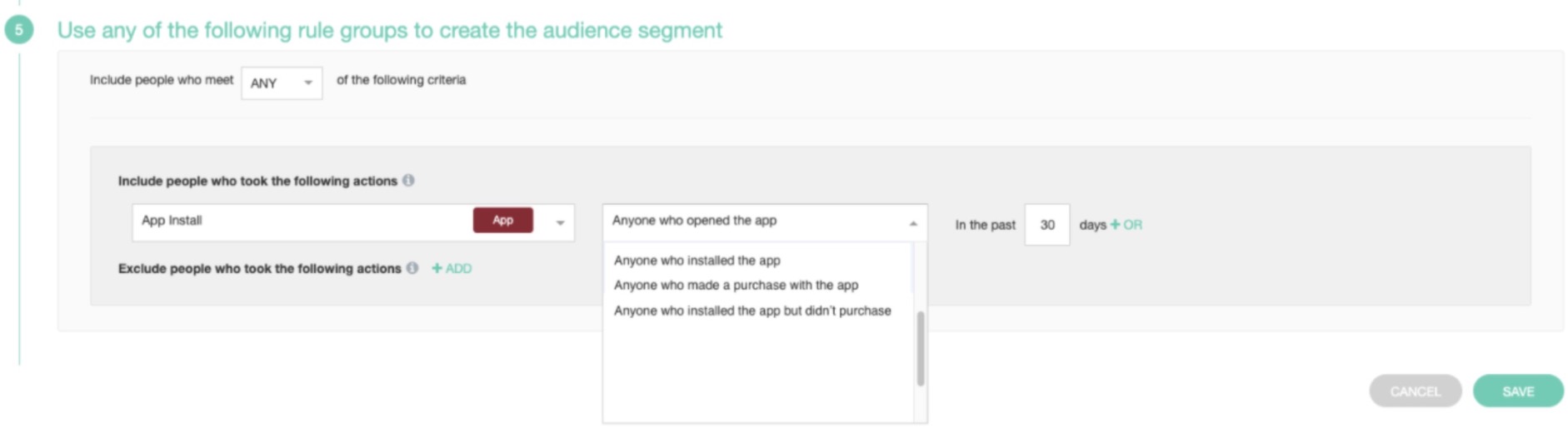 - You can select one rule at a time (Anyone who opened the app, Anyone who made a purchase within the app, Anyone who installs the app, Anyone who installed the app but didn't purchase)