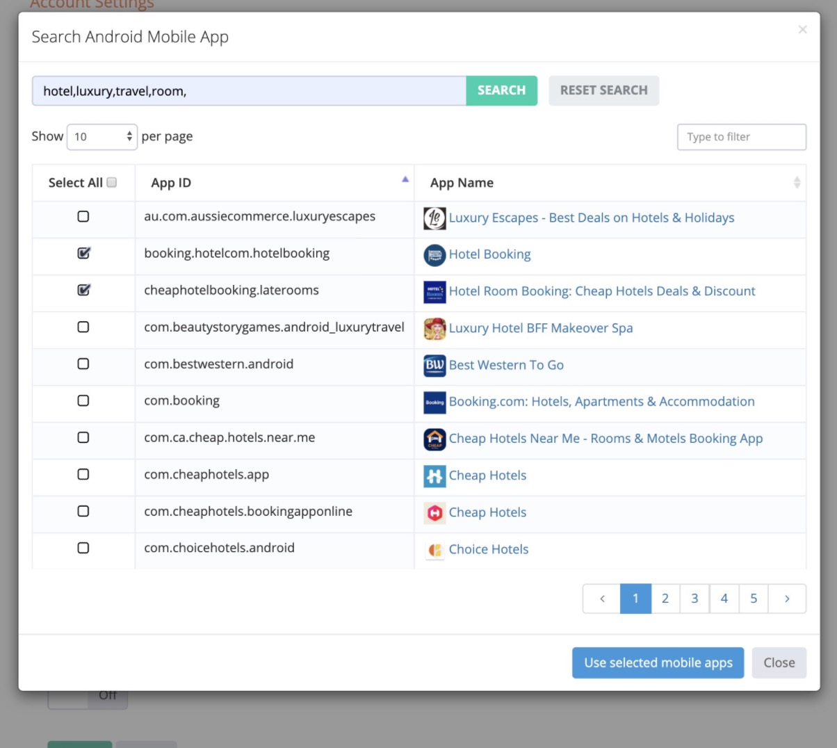 - Click on the Here button to search for the app you wish to add based on name or industry. Checkmark the ones from the dropdown list. Once complete, click Use selected mobile apps, then Save in Account Settings.