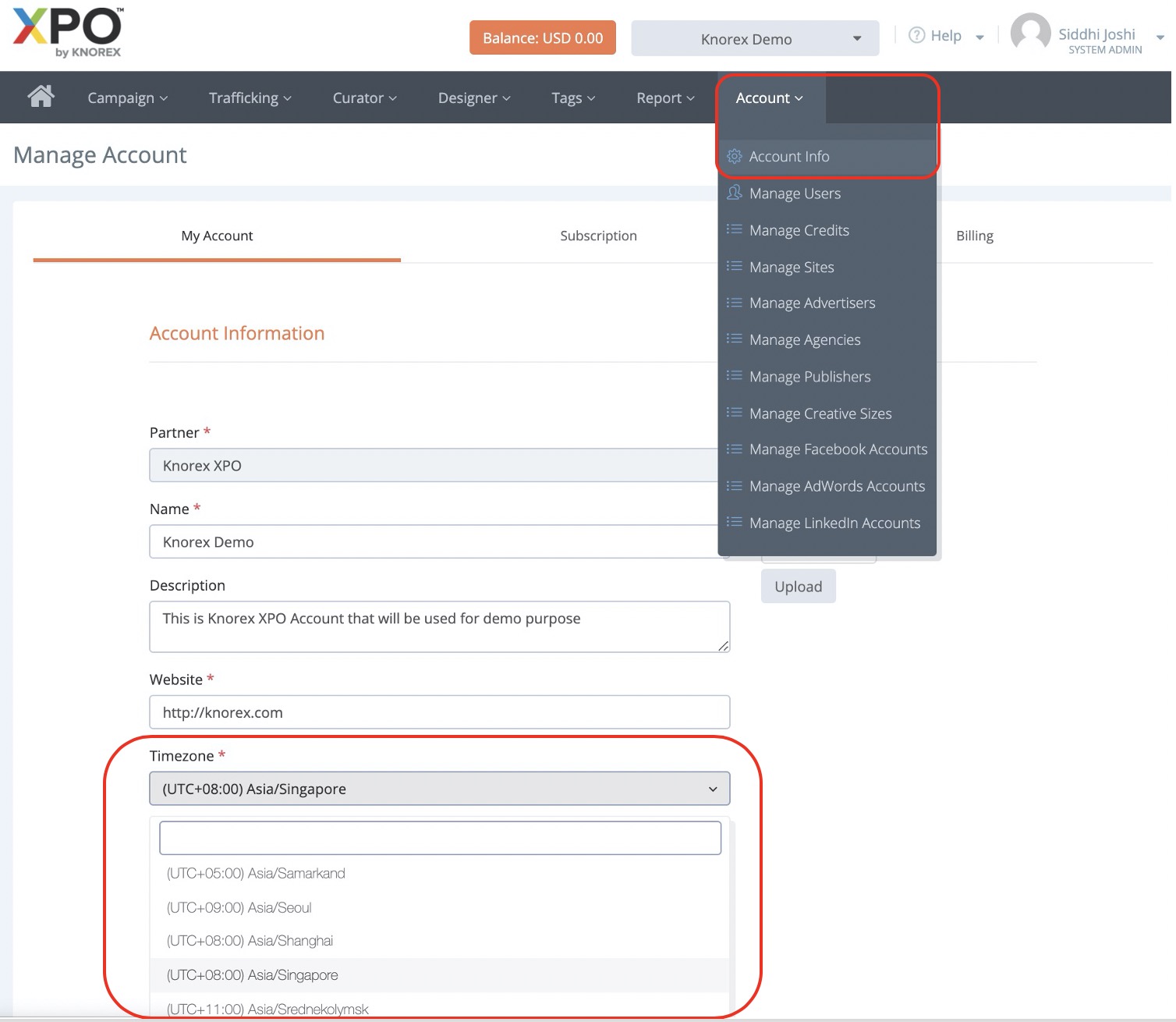 - The account will now operate in that timezone across its activities and settings. Account metrics (all campaigns elements including start/end dates, ad groups, and creative statistics, etc. shall be automatically represented using that timezone