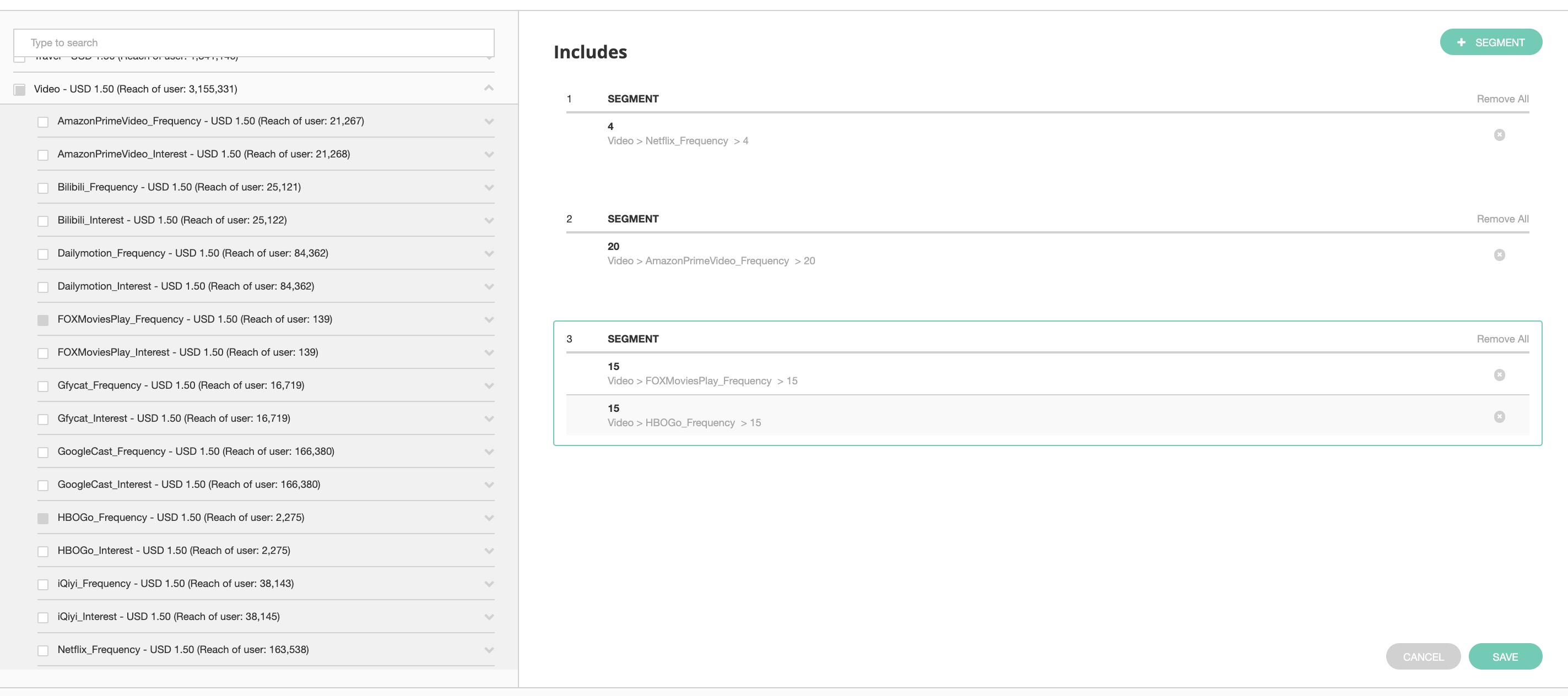 - HBOGo_Frequency value 15 OR FOXMoviesPlay_Frequency 15 as one segment.