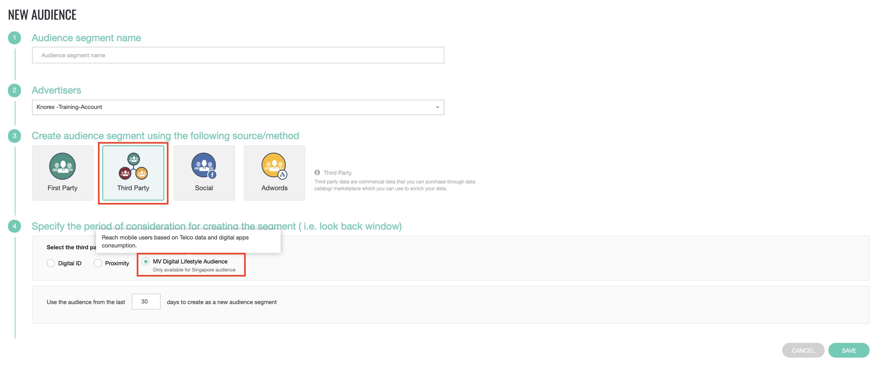 - Select your Audience Type as Third-Party > MV Digital Lifestyle Audience as the audience type > Save.