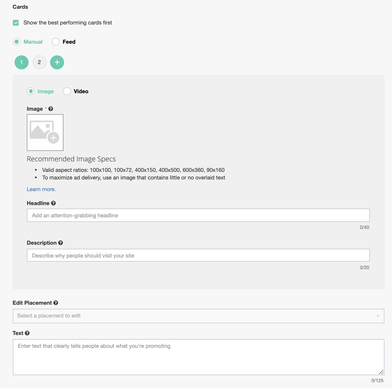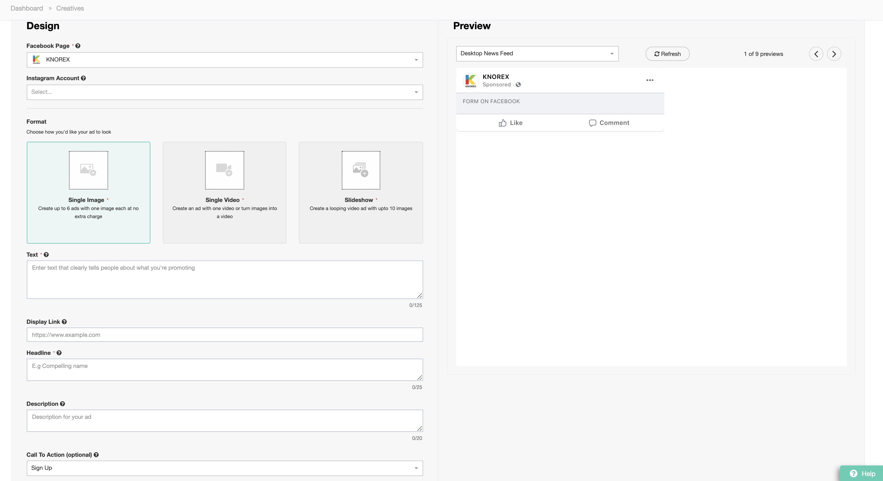 - Key in your creative details such as the text, display link, headline, description, and a call to action if required.