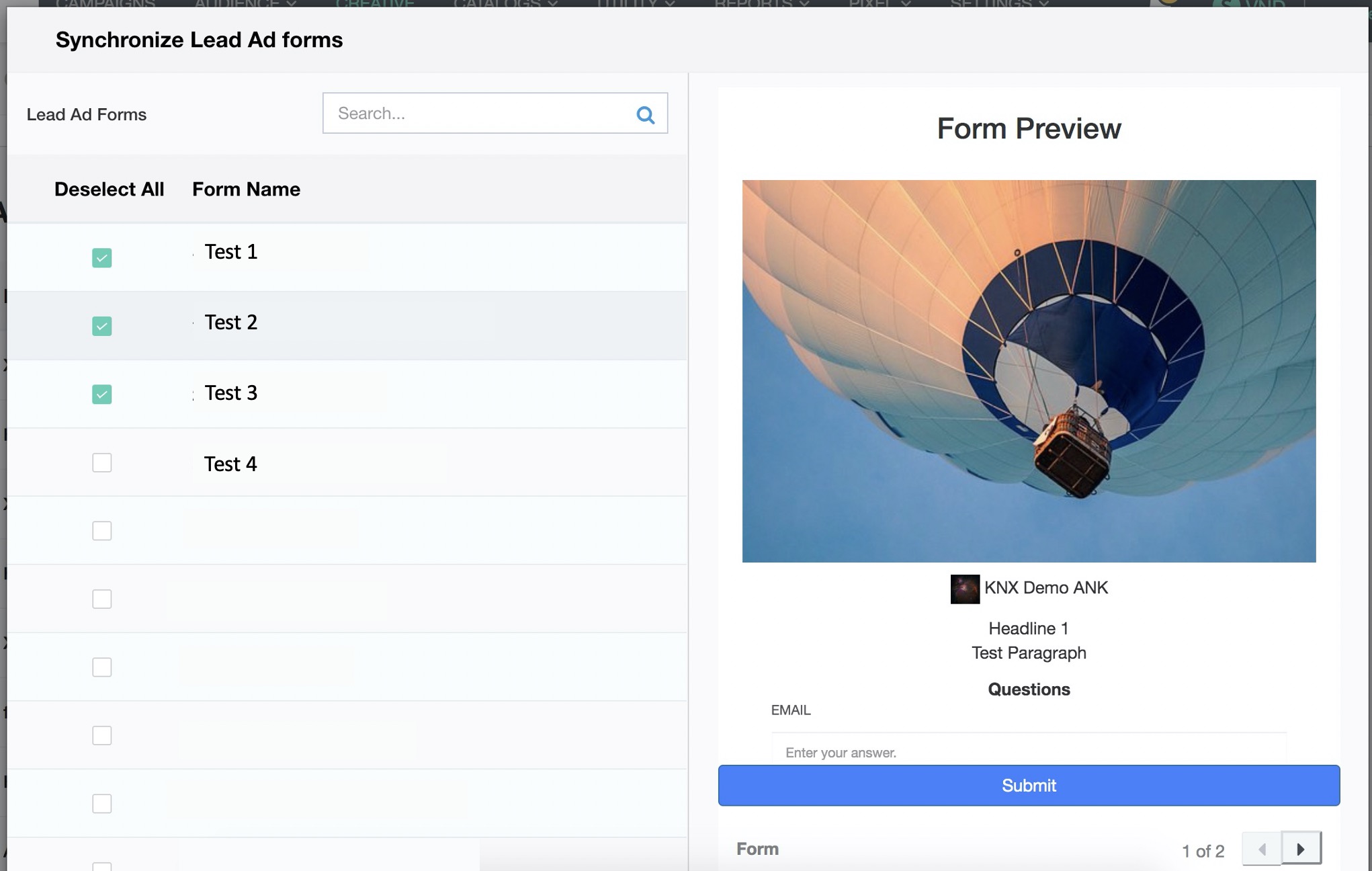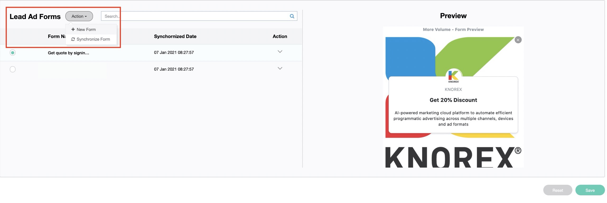 - After selecting the forms and previewing them, click on Synchronize. The list will be refreshed and you will be redirected to the creative ad form.