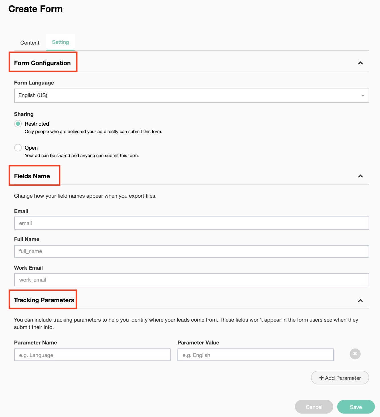 - If you wish to track your leads, you can add parameters that include a name such as a language and the corresponding value such as English to identify where your leads come from. This will not be visible to users.