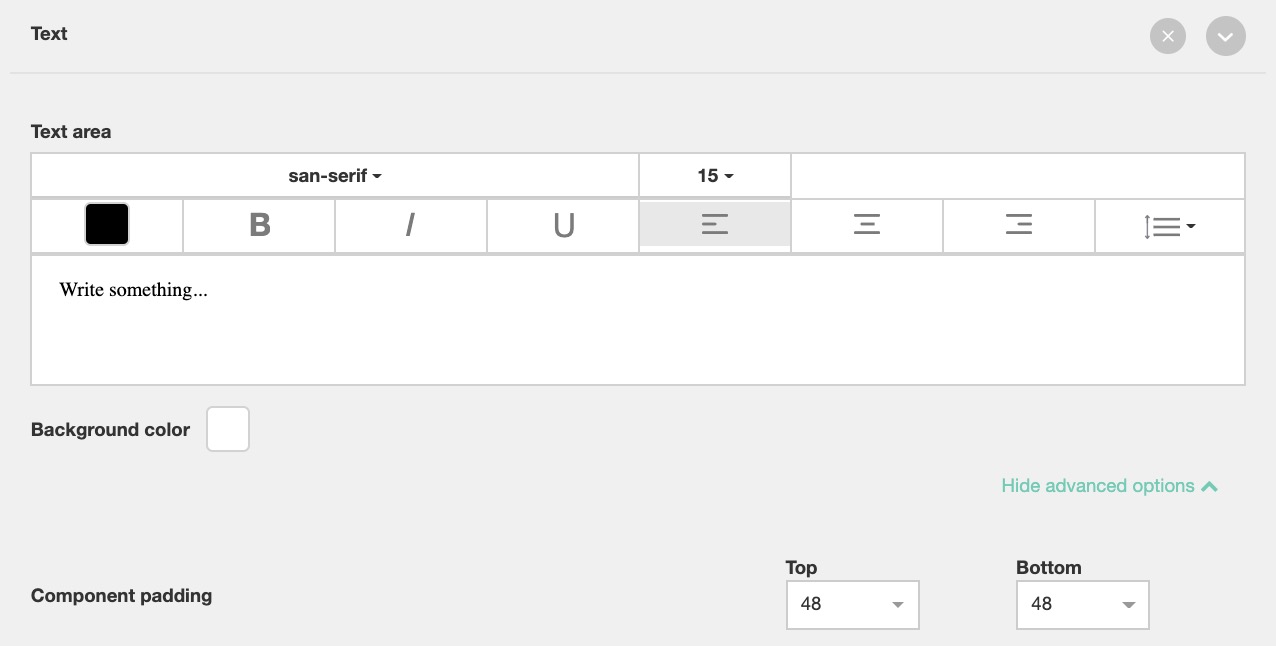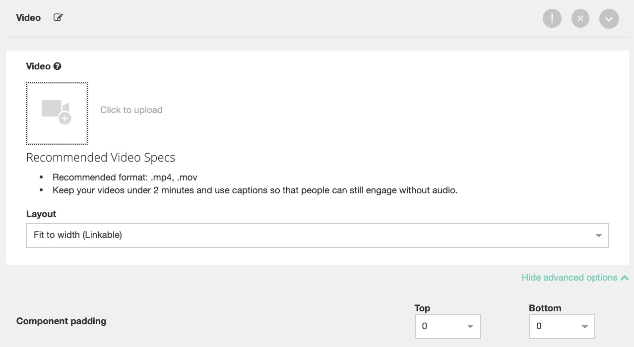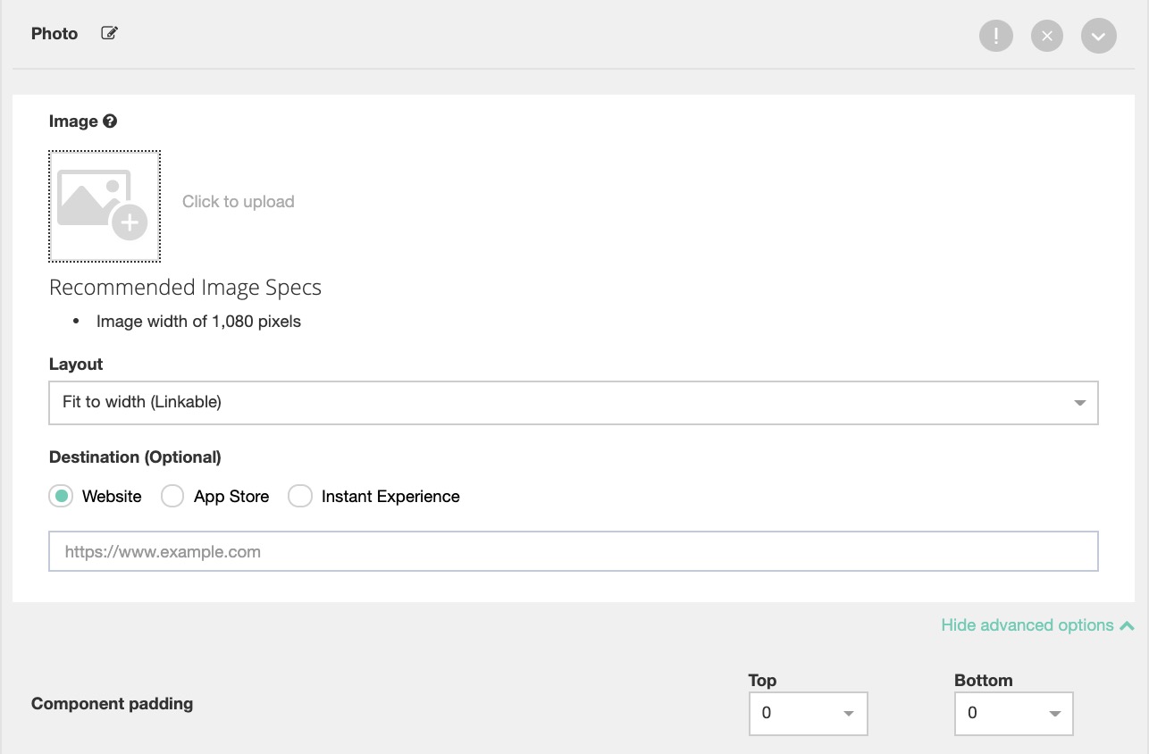 - Component padding under advanced options refers to the spacing adjustment you wish to have between each added component for your Instant Experience. Eg. if 0 is selected there will be no gap between the corresponding top and bottom components.