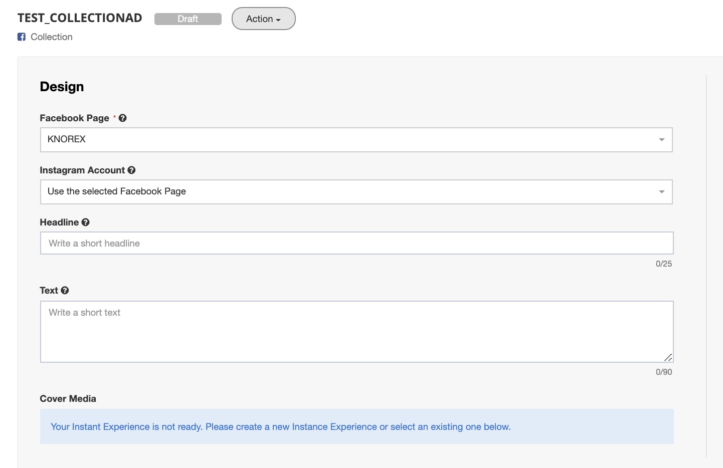 - Cover Media (image or video) displays the first media asset from the fullscreen Instant Experience (explained in the next section). The preview will only be displayed once you have created the Instant Experience.