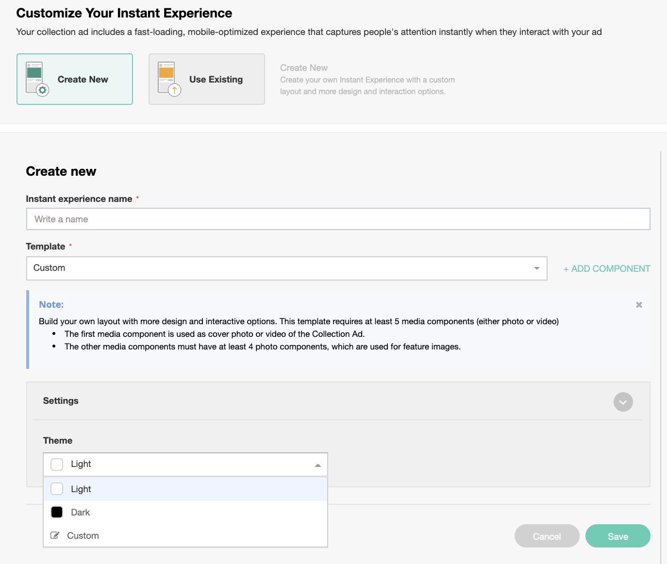 - Adjust your Settings by changing the theme of your Instant Experience. You can choose Dark, Light, or customize your own theme. Once you select a theme, it will be displayed in the preview section.
