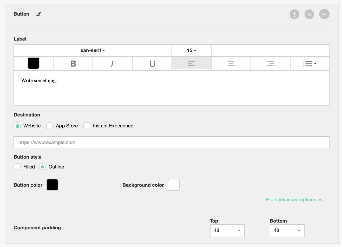 Button components provide your prospects with the option to take an action by adding a button (call-to-action) to your Instant Experience. Design Options