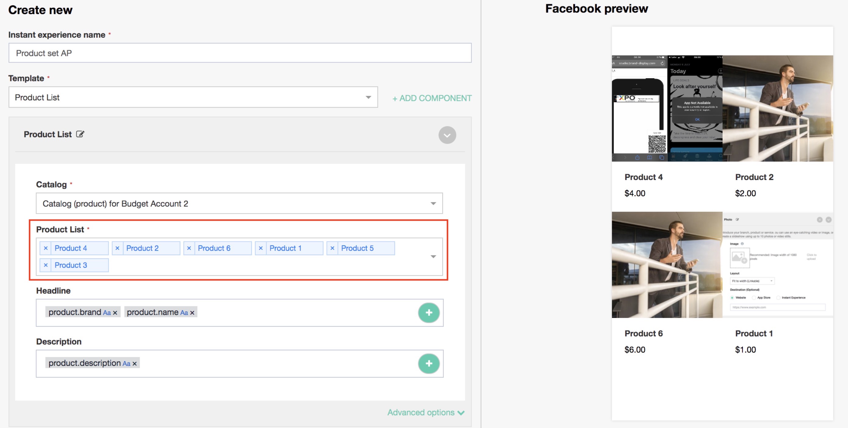 - From your selected catalog feed, details such as price, description, title, name, product ID, etc. will be previewed while creating the Product List. For instance, in the above image, Headline, and Description fields are added from details fetched from the selected catalog feed.