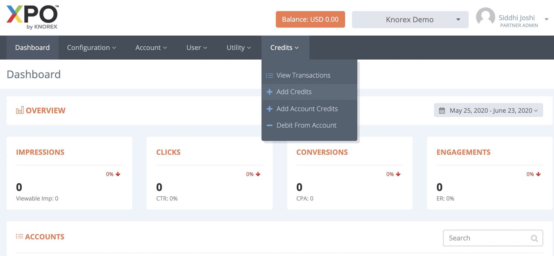 b) You will be directed to XPO Admin Dashboard. Click Credits > +Add Credits.