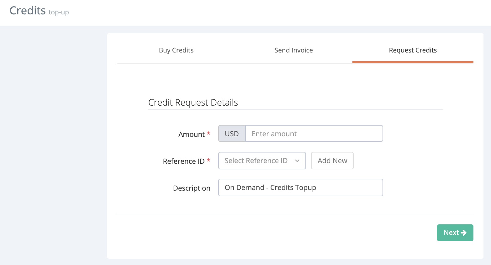 - Key in your credit request, reference ID (quotation number with signed documents), and click Next.