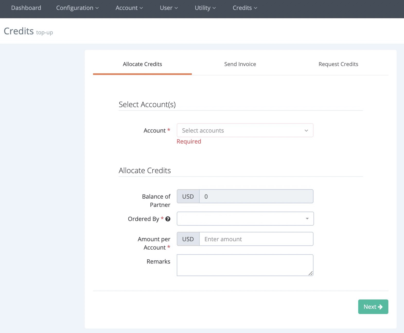 You must be either a Partner Admin or a System Admin to have sufficient user permission to be able to top up credits (or allocate budget).