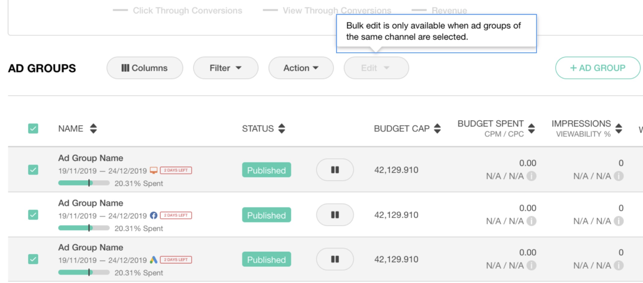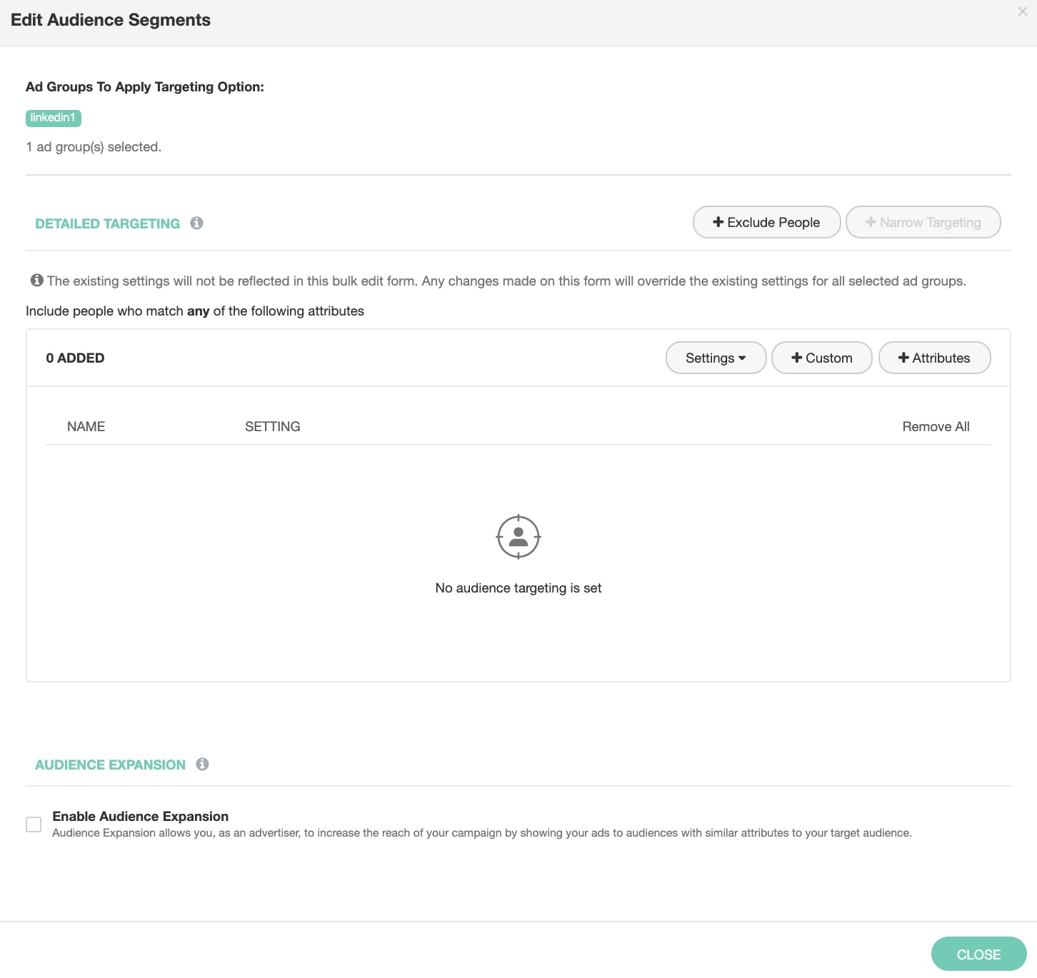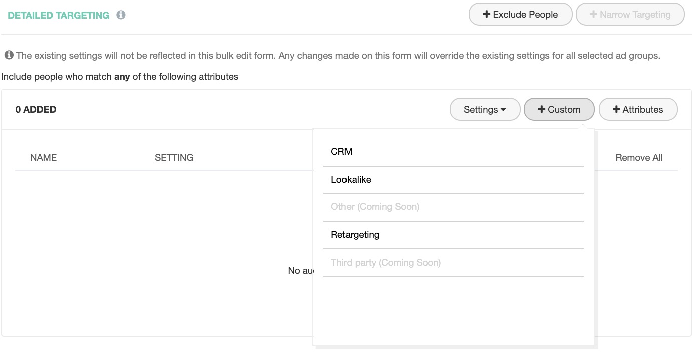 In XPO, you can bulk operate (i.e. add, remove or edit) targeting options for multiple ad groups all at once in a single step.