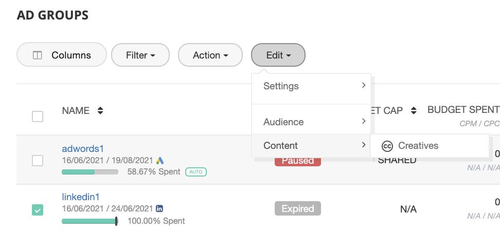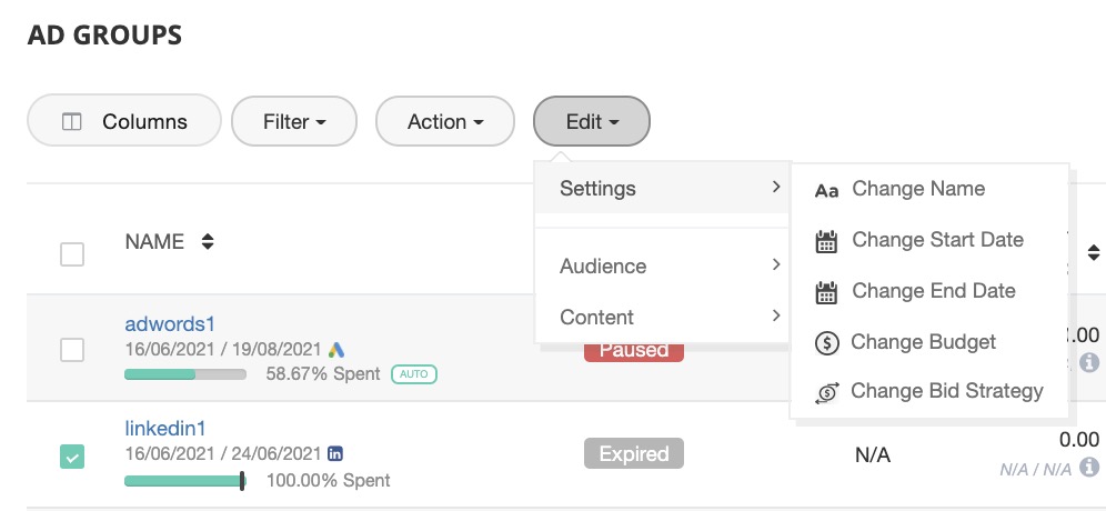 Here, you can change ad group(s) details: