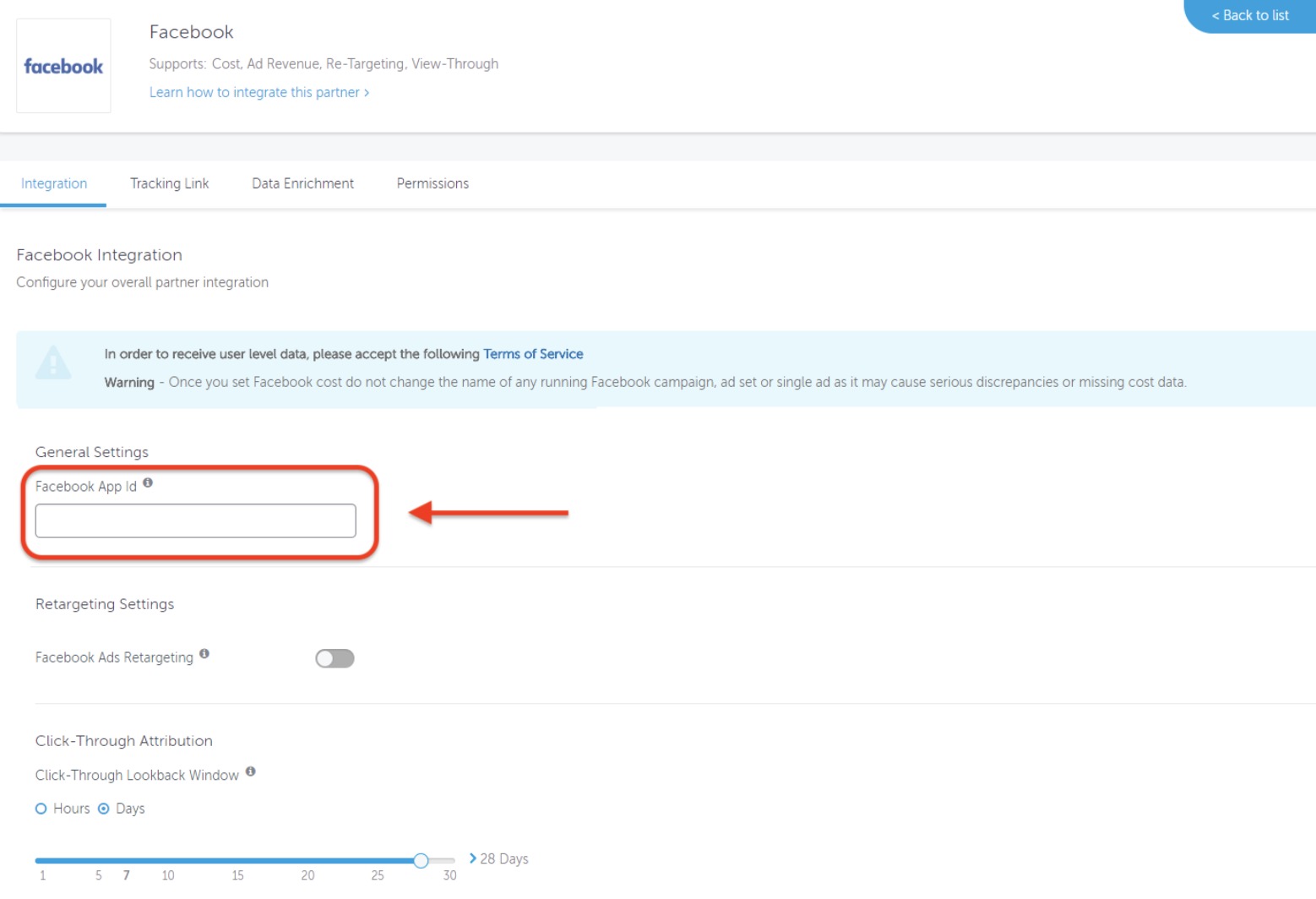 - Under Integration -> General Settings, type in your Facebook App ID. (NOTE: contact your Knorex account manager to create the Facebook app)