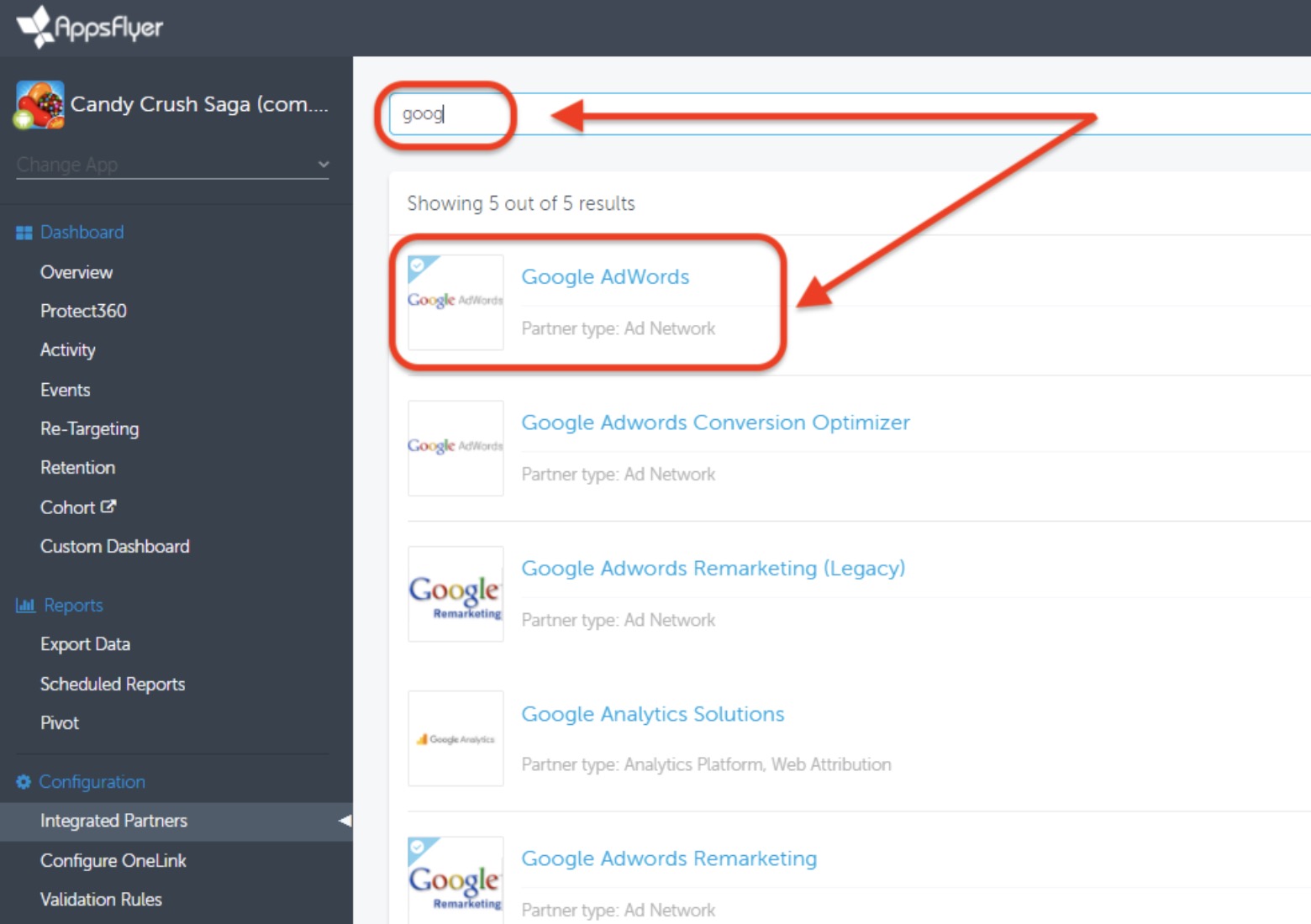 - On the sidebar of your AppsFlyer account, go to Configuration -> Integrated Partners, then search and click Google Ads (fka, Google Adwords):
