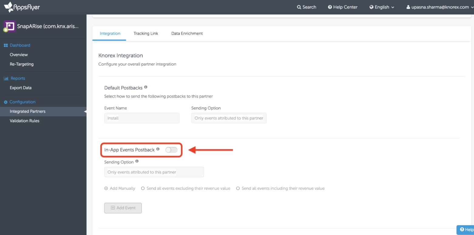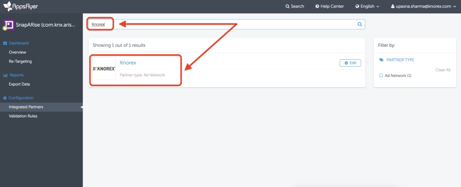 - On the sidebar of your AppsFlyer account, go to Configuration -> Integrated Partners, then search for "Knorex" and click on it to open the setup page: