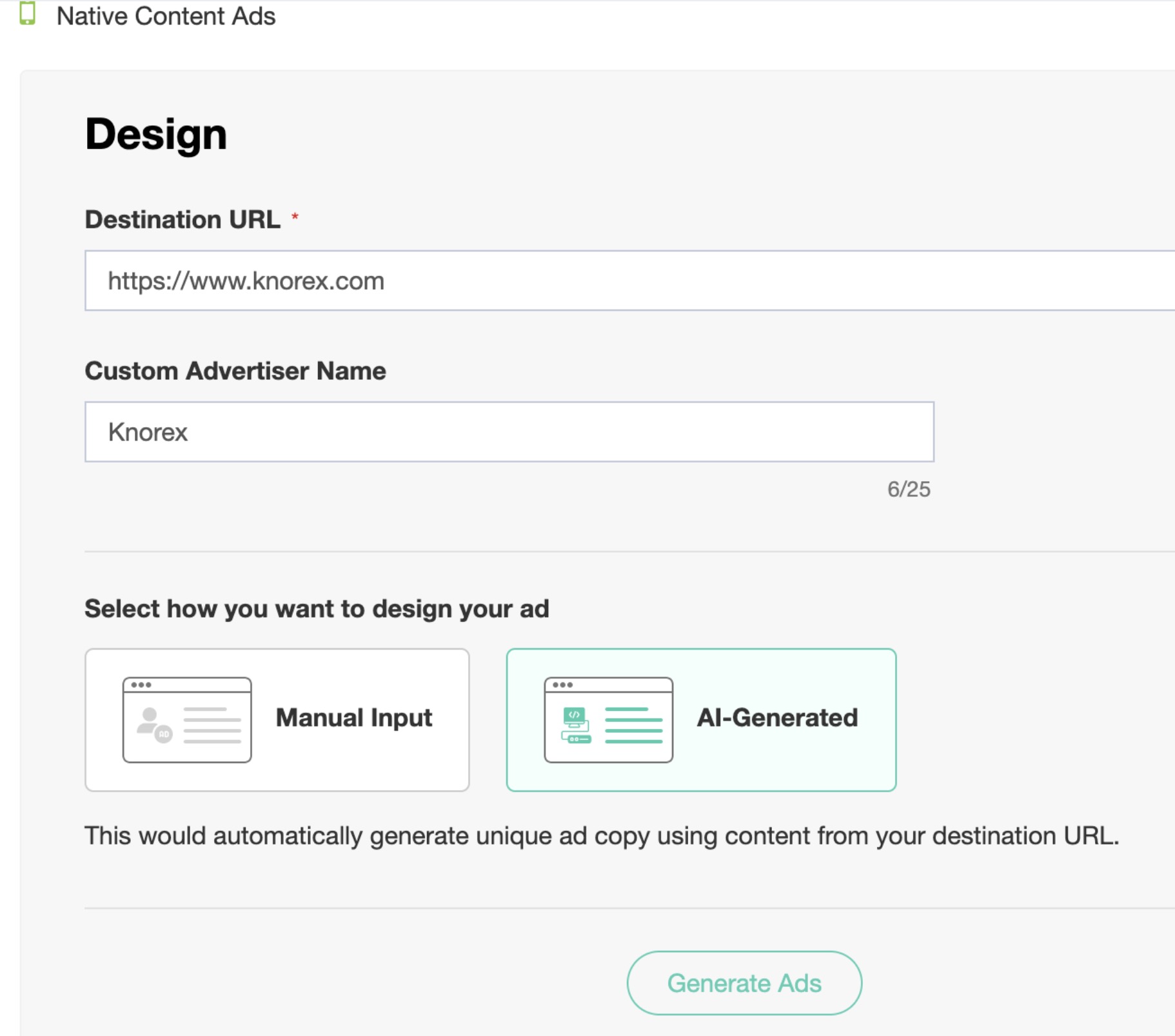 - Once an ad is saved, you will not be able to change from AI-generated to Manual based Native ads. You can still revise the creative and design form, such as the headline, body text, CTA, image, and logo.