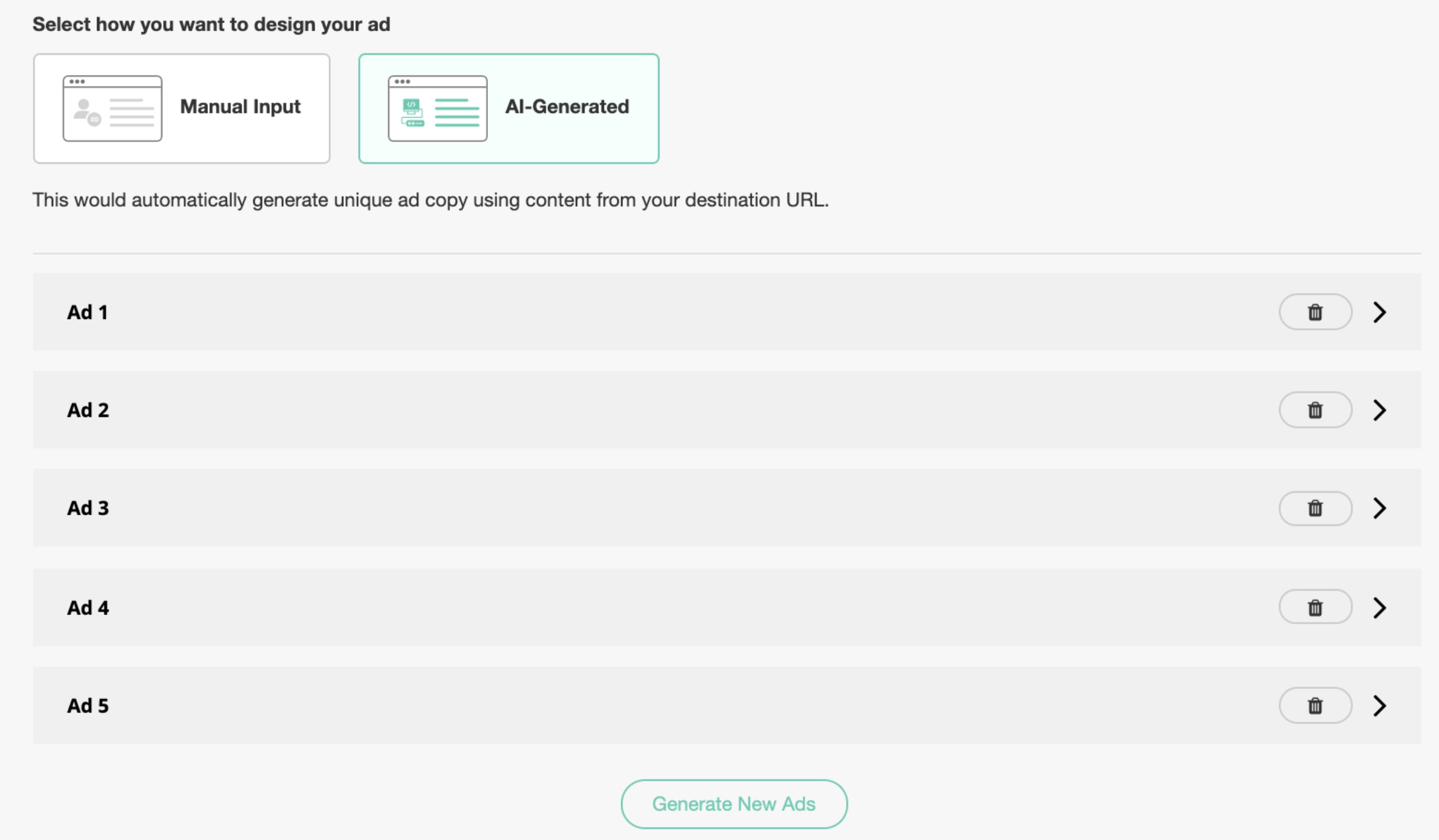 - Once completed, you will be presented with 5 AI-generated ad variants. Click to expand each ad to view the details: