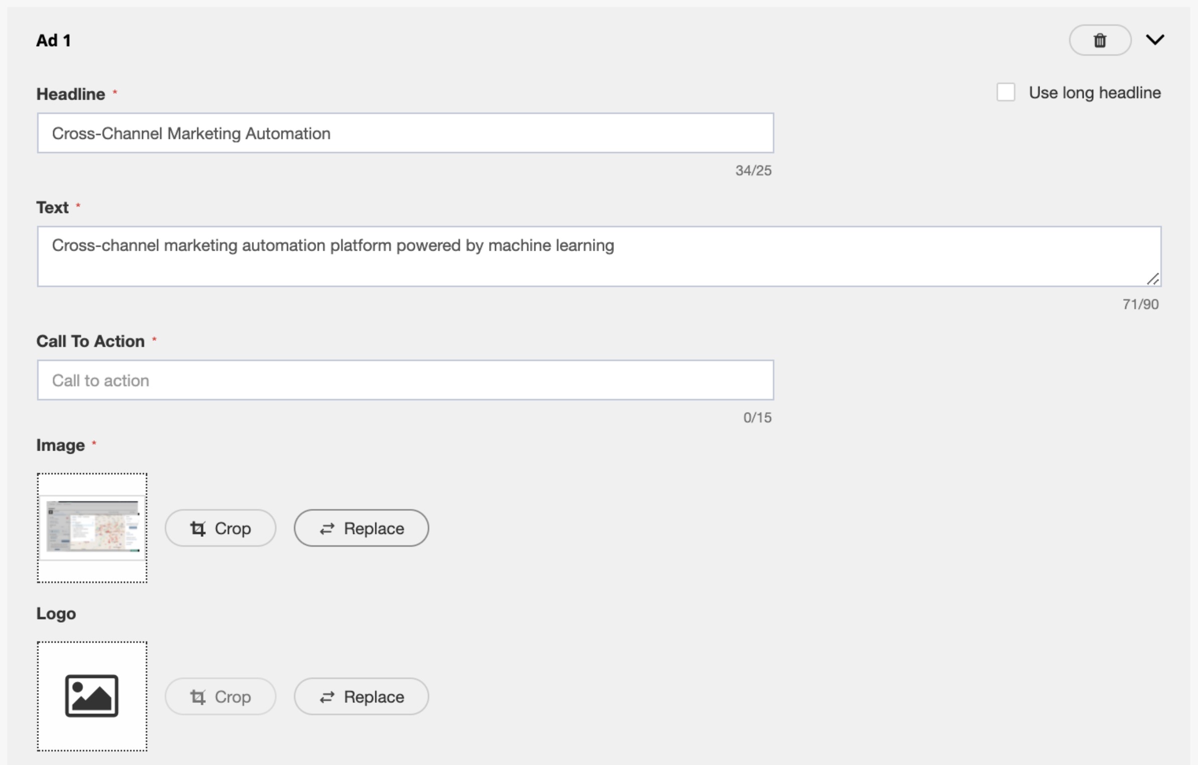 - CTA: the Call to Action button for the ad, with a maximum character limit of 15.