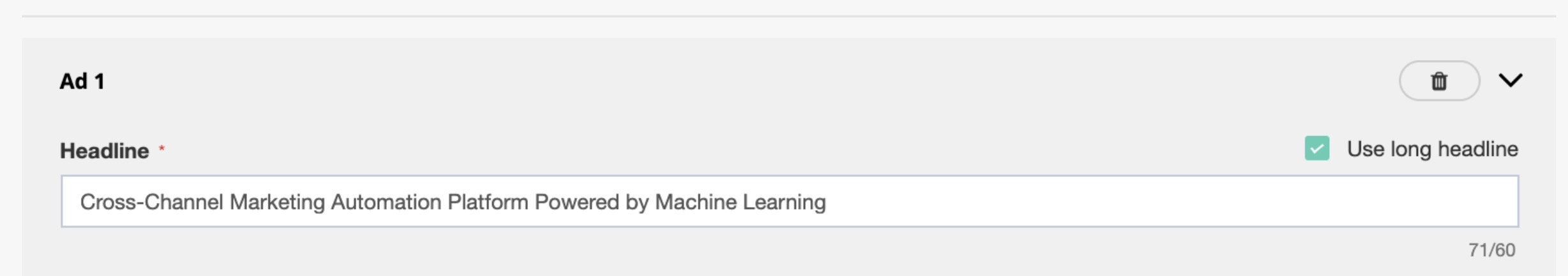 Headline: an attractive headline from the destination URL with a maximum of 25 characters. Select "Use Long headline" if you wish to extend the headline to a maximum of 60 characters (alphanumeric + special characters).