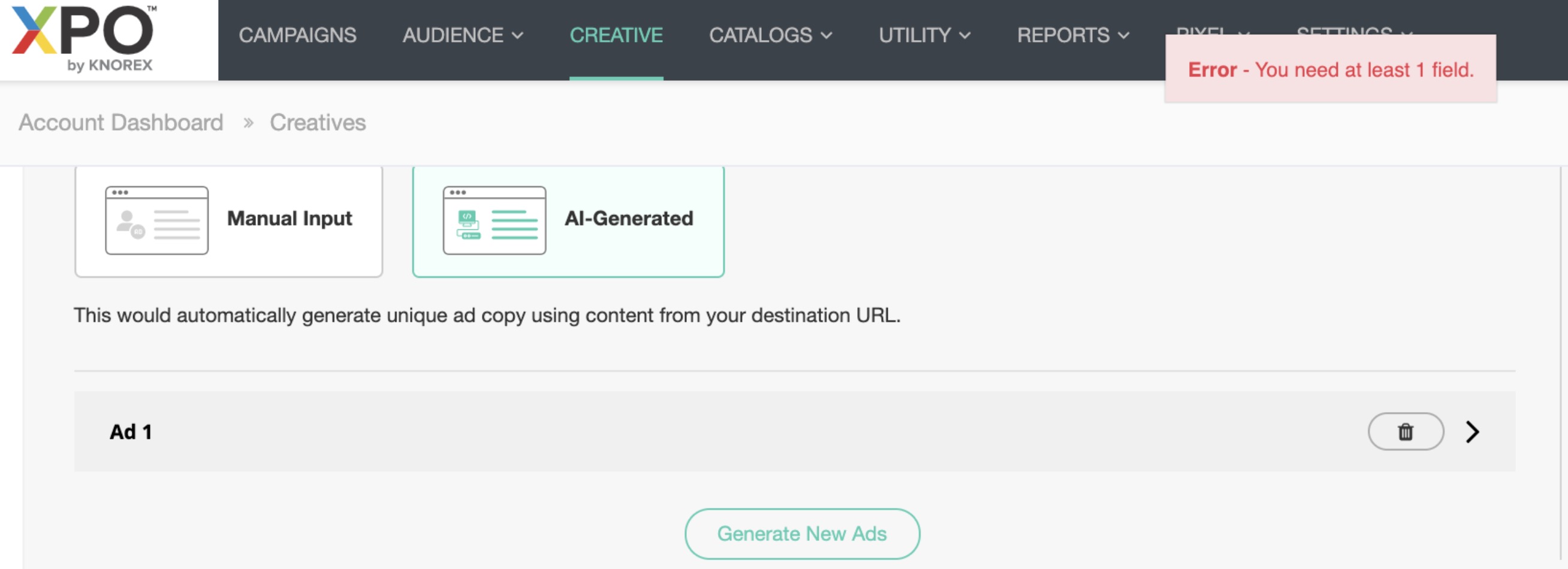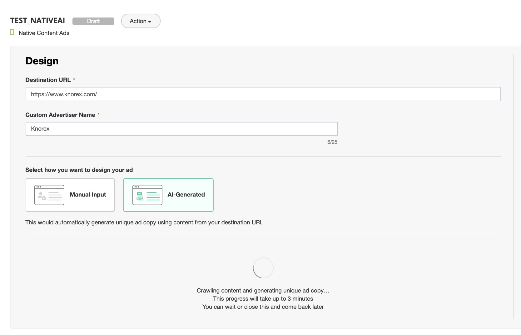 With XPO, you can now streamline the ad creation process by using the built-in Knorex KAIROSsm AI Engine. This feature assists you in creating content-based native ads without the need for manual creation.