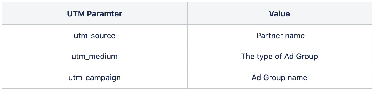 - Values of UTM parameters will change based on the combination of ad groups and creatives, such as Ad Group type, Ad group name, and Creative destination URL.