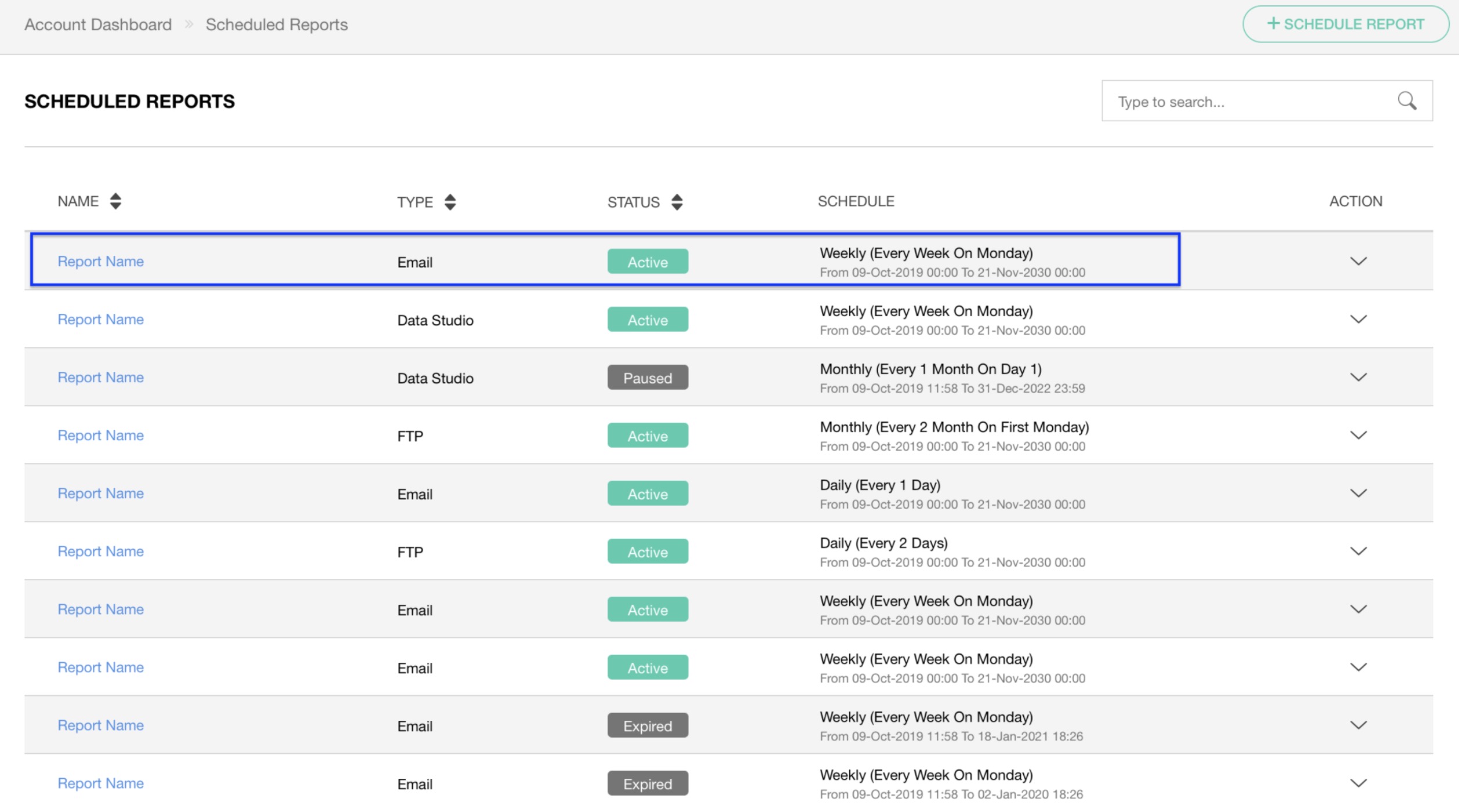 Name Name of the report. Type The delivery method selected for the report (See point4 below for a detailed explanation). Status Status of the schedule report (i.e. Active, Paused, and Expired).