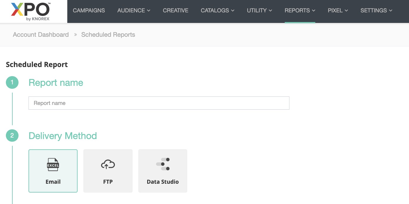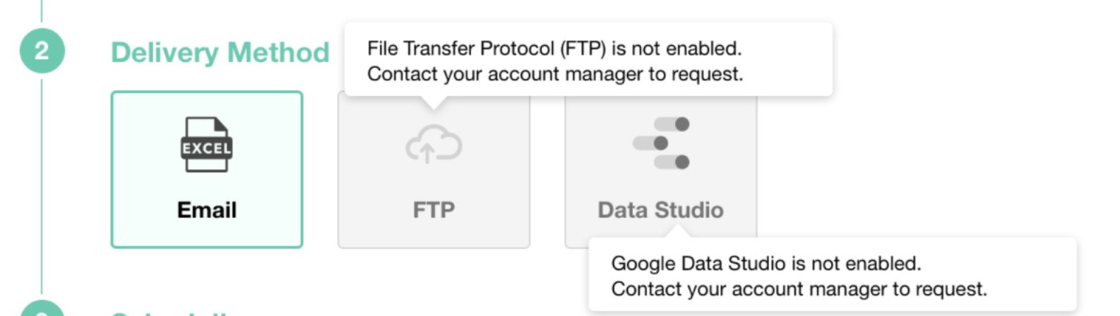 Delivery Method Description Email Reports will be emailed to your specified recipients according to your defined schedule. FTP (coming soon) Reports will be uploaded through the FTP server according to your defined schedule. Google Data Studio Reports will be synchronized with the Google Data Studio according to your defined schedule.
