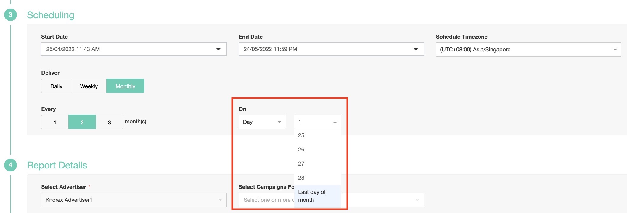 By default, today’s date will be set as your Start Date. The End Date will be set after one month. The Advertiser time zone will be set by default.