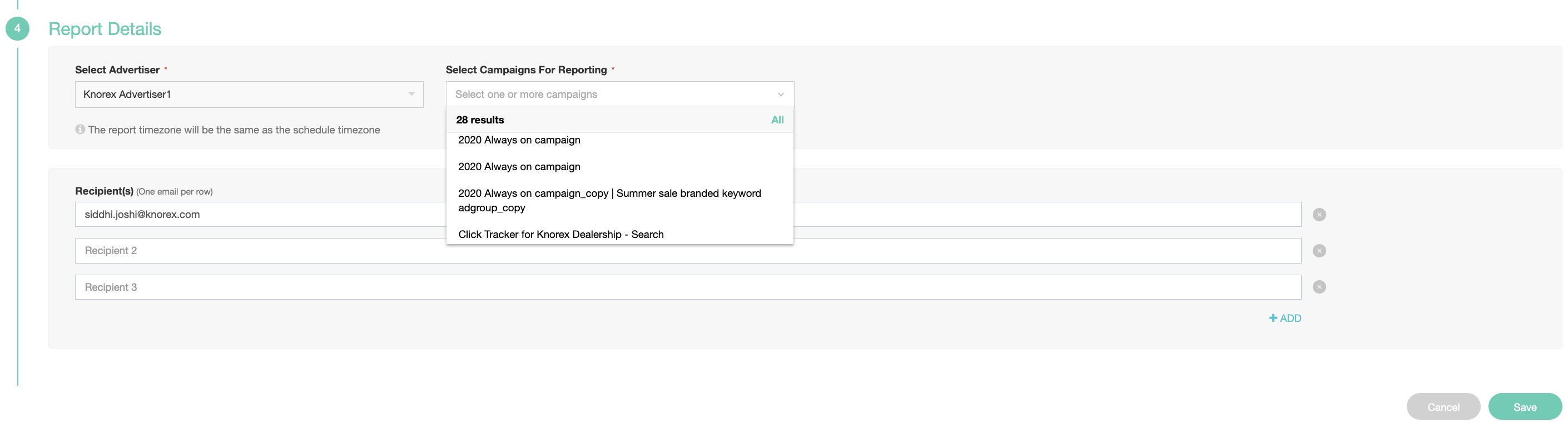 A. If you selected Email as your Delivery Method in step 4, you need to select the Advertiser as well as the Campaign(s) for reporting. You will then need to add the recipient(s) for these reports.